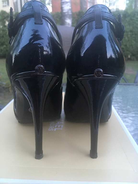 Черные блестящие туфли на высоком каблуке.