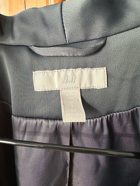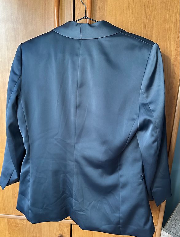 36. izmēra sarkana tvīda žakete. Iekšpusē ir caurspīdīga podziņa, lai aizpogājot nepogājas vaļā. Plecos ir polsteri.