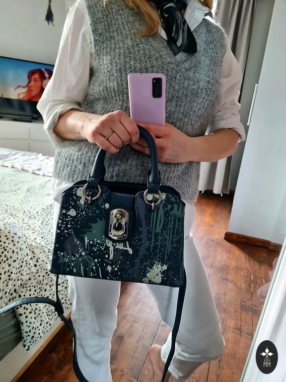 TH rankinė, mažai naudota. Viduje virš kišenės, nedidelė dėmė nuo lūpų blizgio.