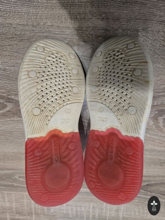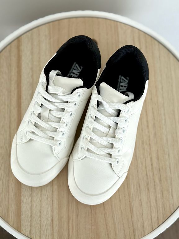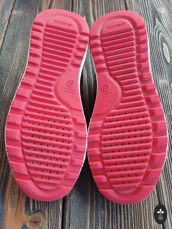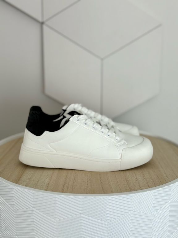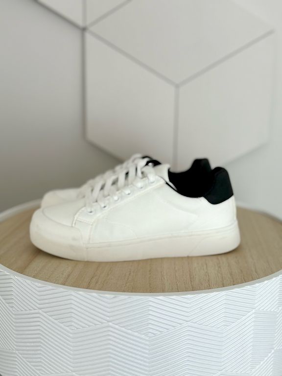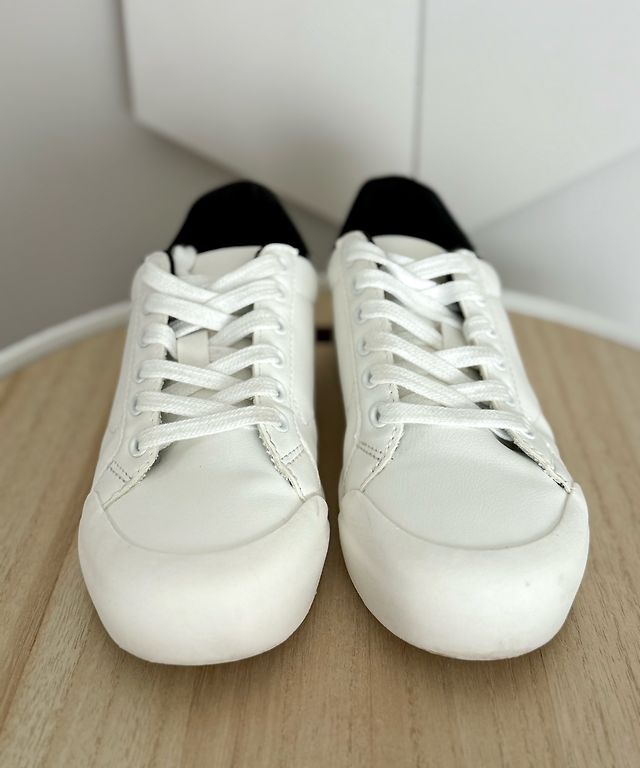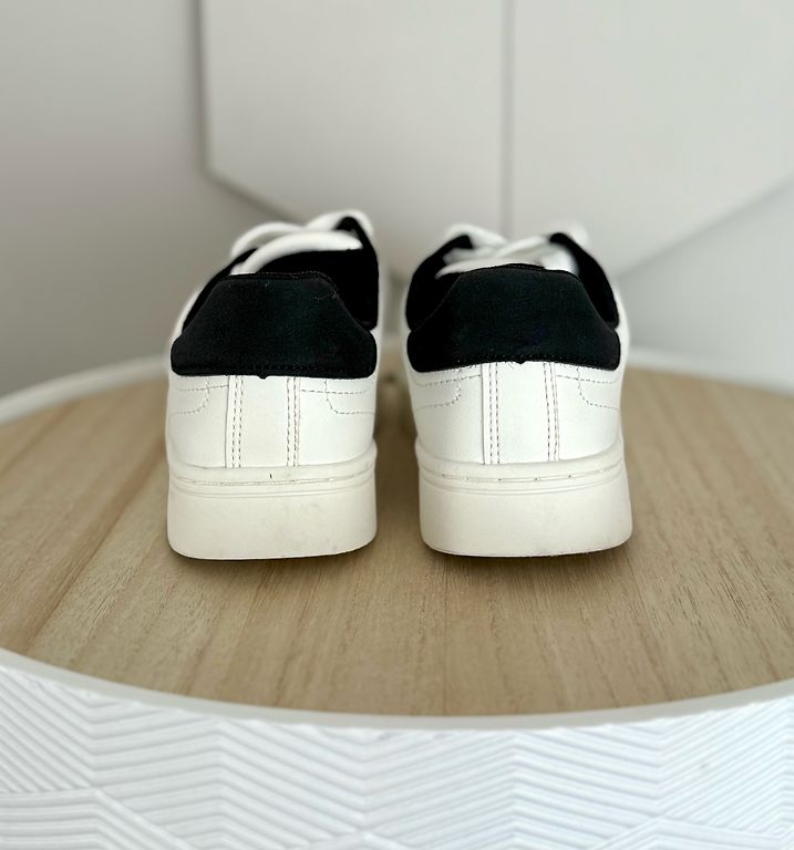Pāris reizes vilktas, taču šķiet no āra aktivitātēm apavu apakšdaļā uz baltās joslas redzamas pelēcīgas krāsas “zīmes” (redzams bildēs)