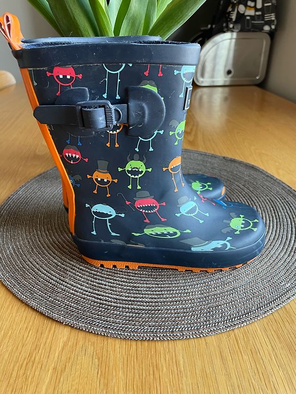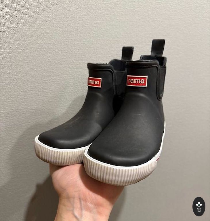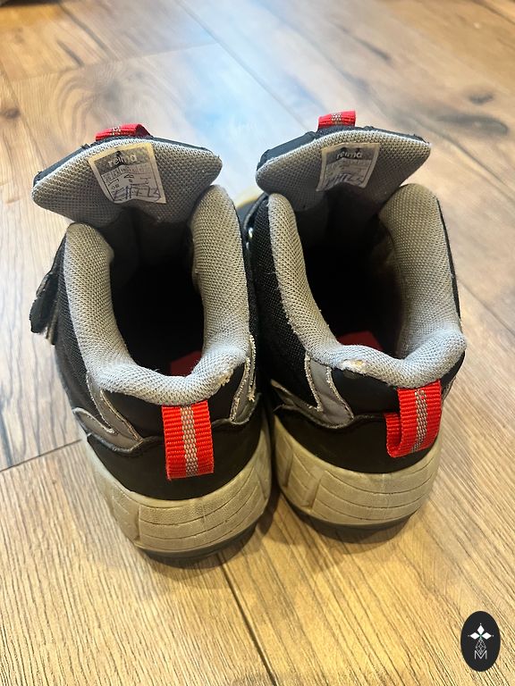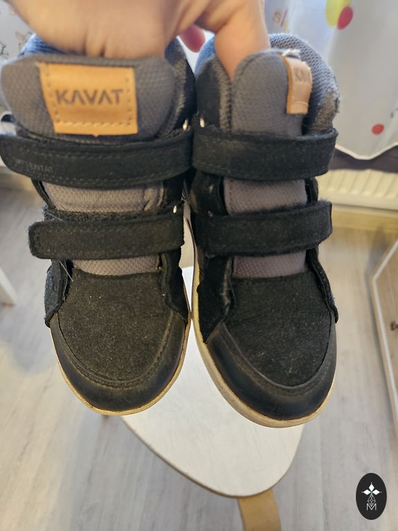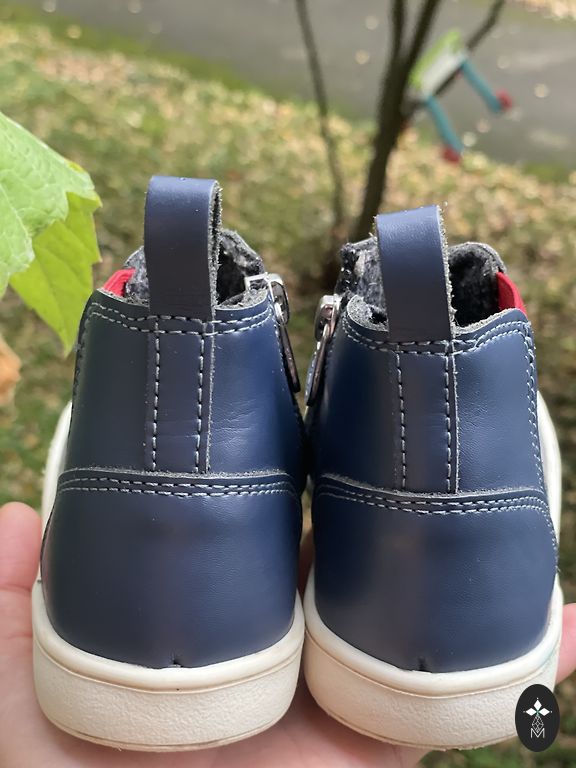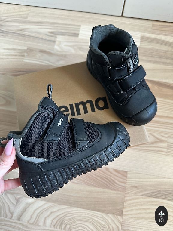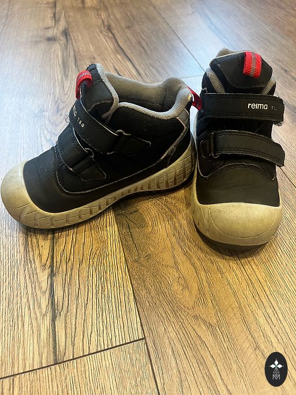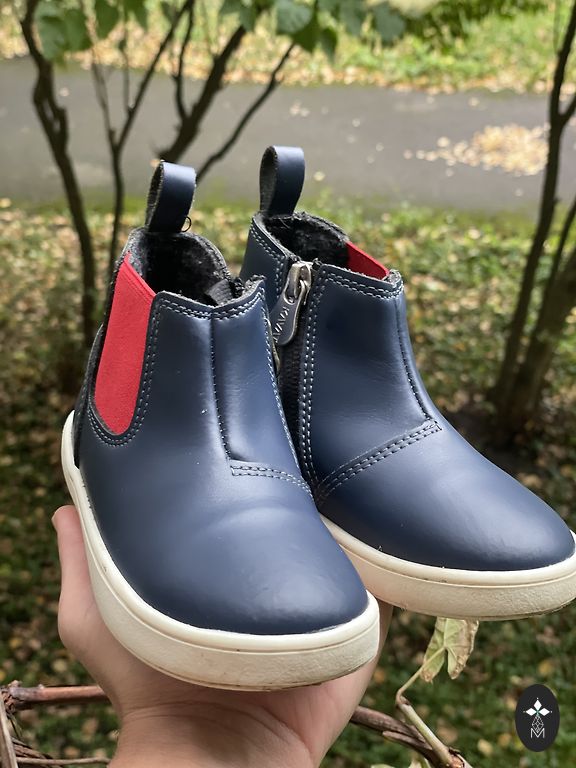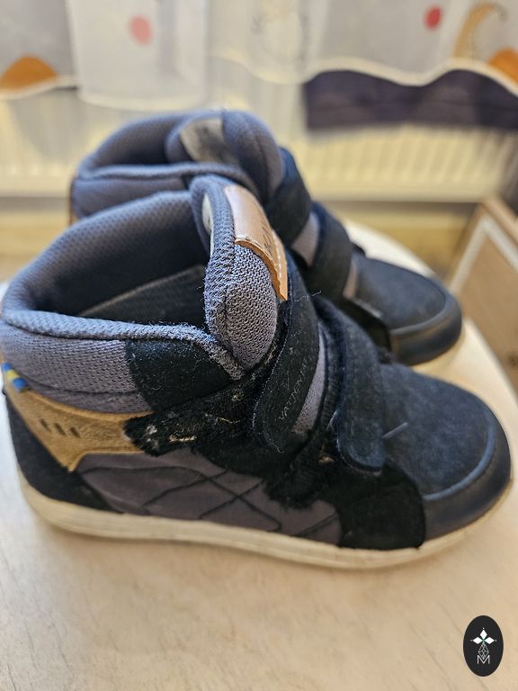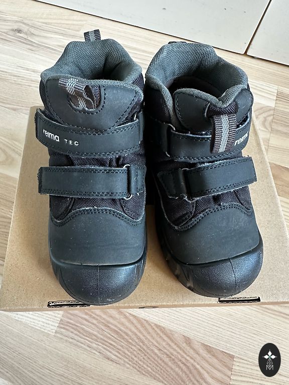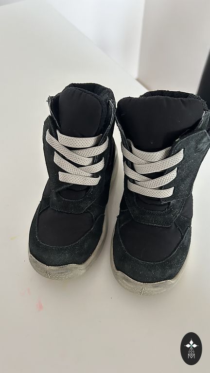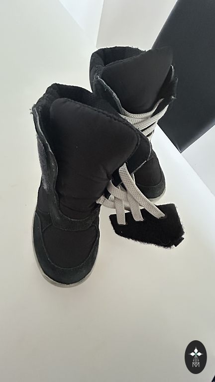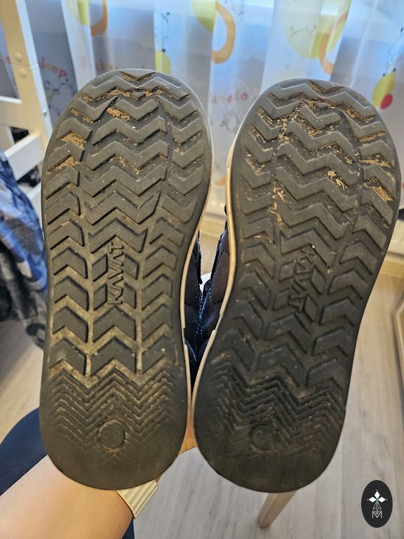 Bogs melnie zābaciņi ar dažiem trūkumiem- priekšpusē atiruši dekoratīvie diegi (kas, šķiet, zābaciņu vājā vieta) un kopumā ir palietojušies, jo pirkām jau lietotus tepat Andelē. Mitrumu cauri nelaiž, tā kā noderēs vēl kādam bērnam 😉 Un šim laikam derēs ideāli, jo gan silti, gan mitrumu aiztur.
