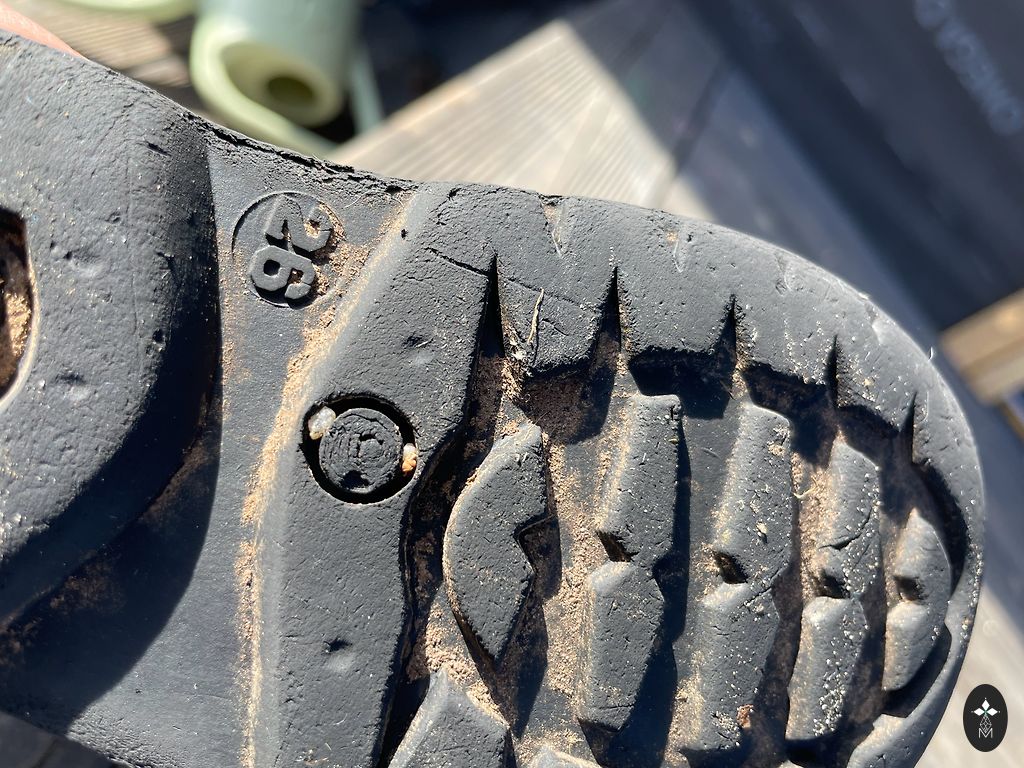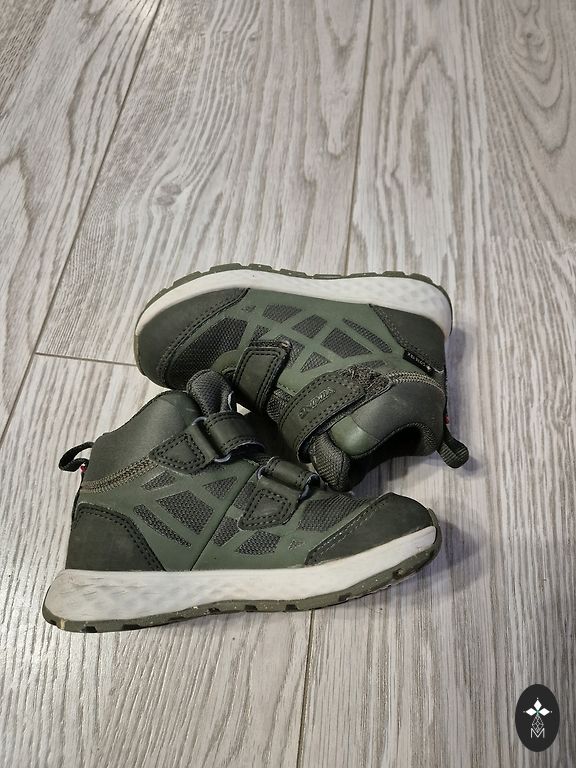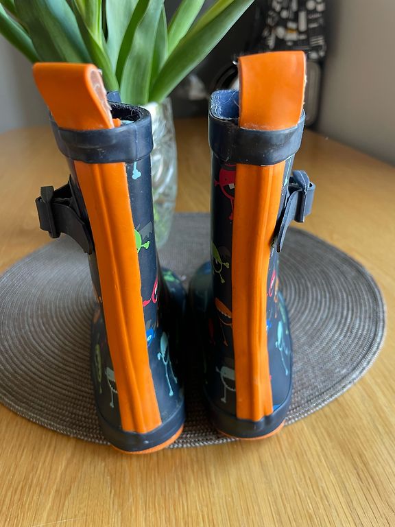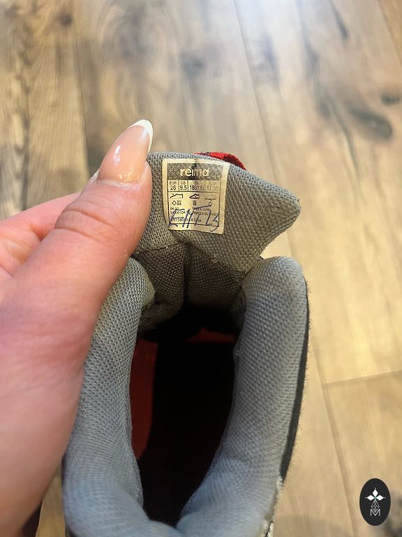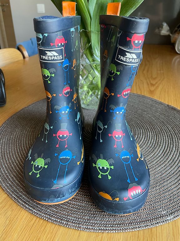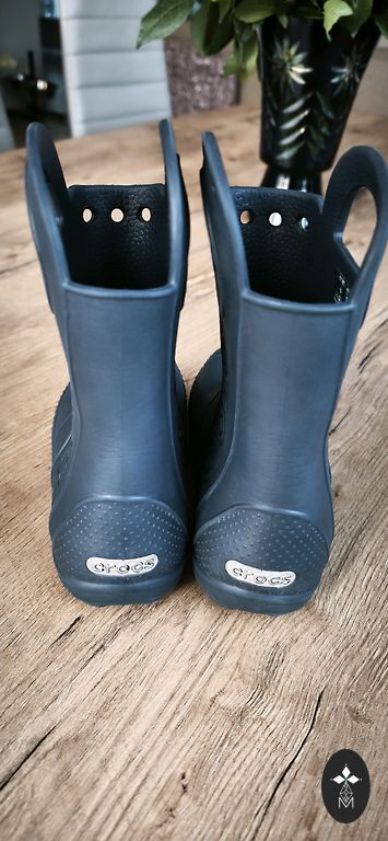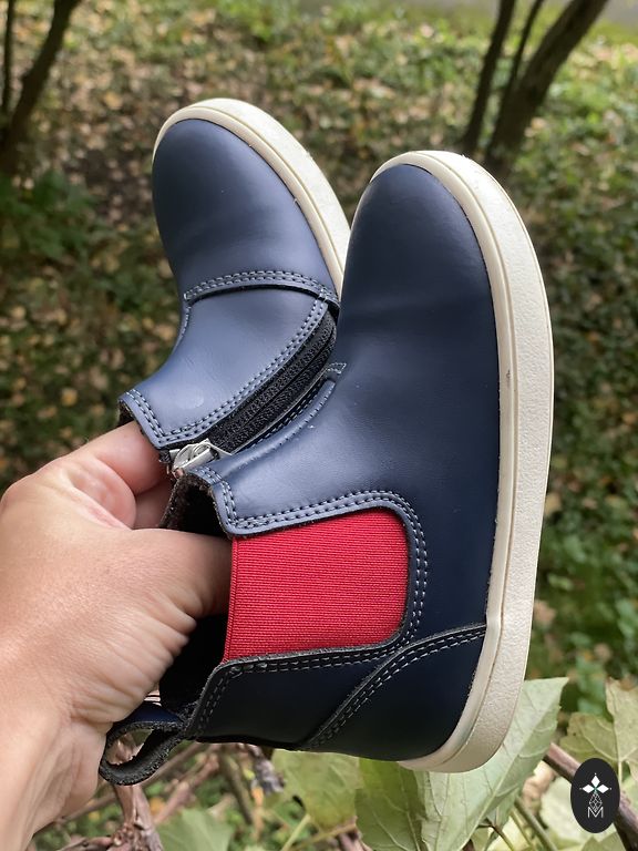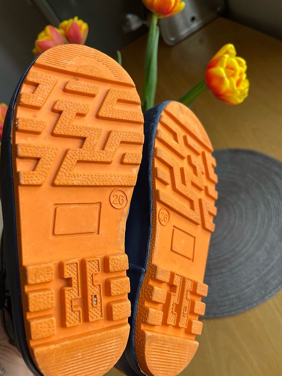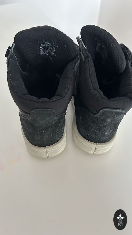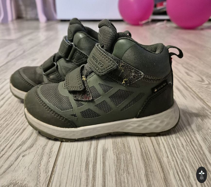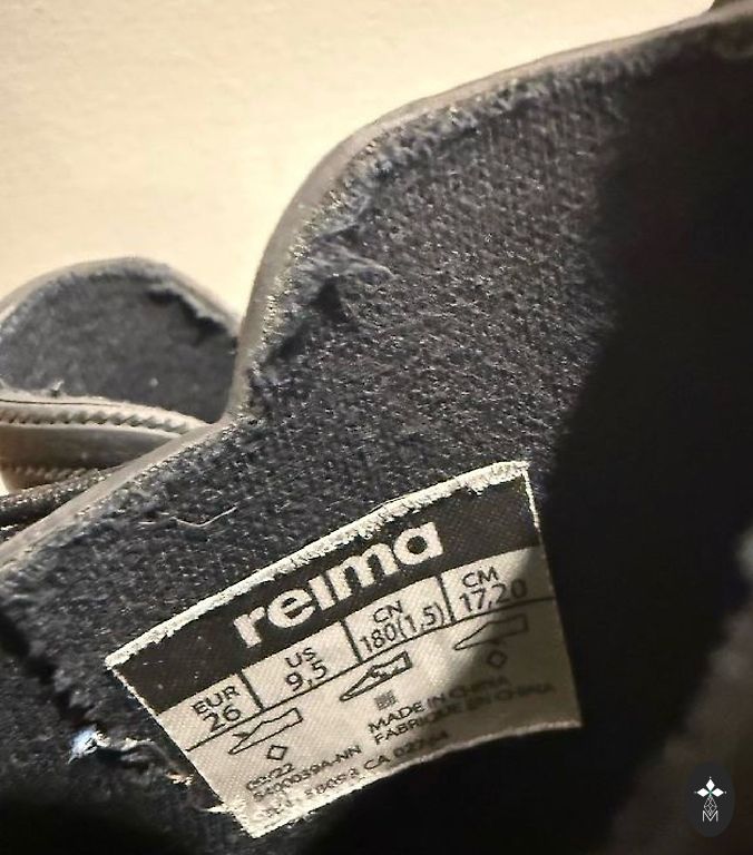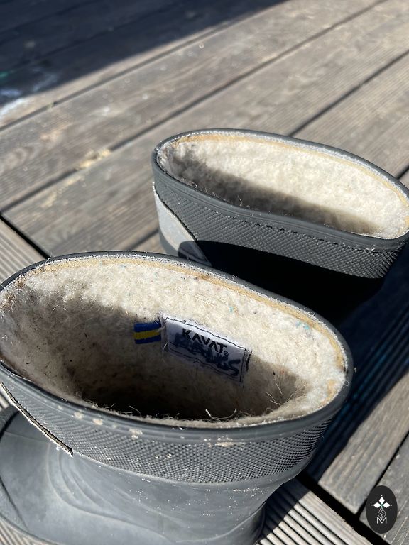 Bogs melnie zābaciņi ar dažiem trūkumiem- priekšpusē atiruši dekoratīvie diegi (kas, šķiet, zābaciņu vājā vieta) un kopumā ir palietojušies, jo pirkām jau lietotus tepat Andelē. Mitrumu cauri nelaiž, tā kā noderēs vēl kādam bērnam 😉 Un šim laikam derēs ideāli, jo gan silti, gan mitrumu aiztur.