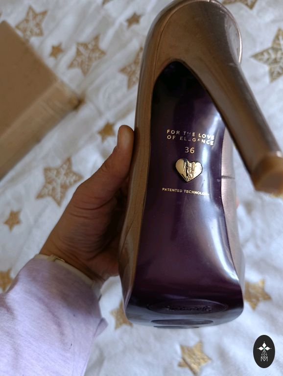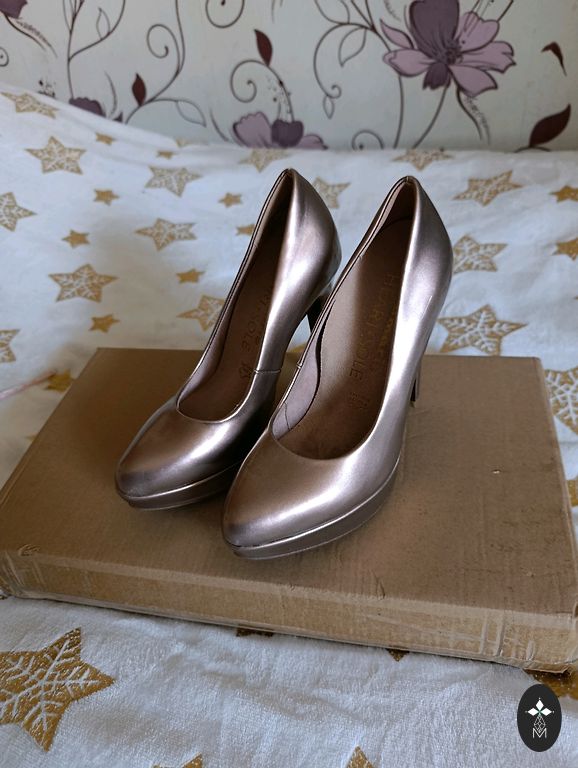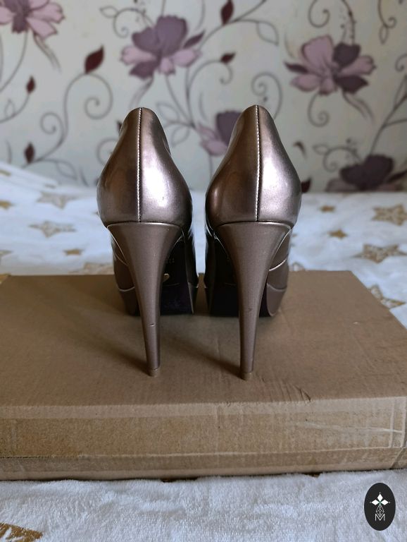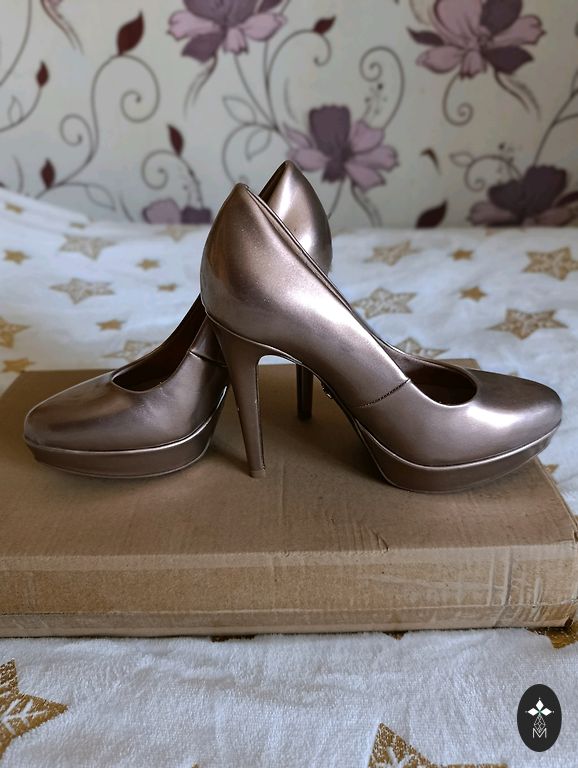 Zelta krāsas izejamās spicenītes. Papēdis apmēram 6cm. Tika iegādātas svinīgam pasākumam, bet tā arī netika uzautas. Nāk izlaidumu laiks, varbūt kurpītes te atrod īsto saimnieci un pielietojumu...