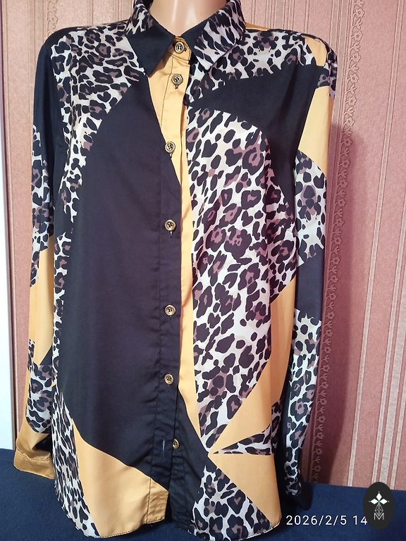 Moteriška palaidinė. Pečiai 48 cm, krūtinė 134 cm, apatinė kraštinė 136 cm, rankovė 60 cm, ilgis 65 cm.
