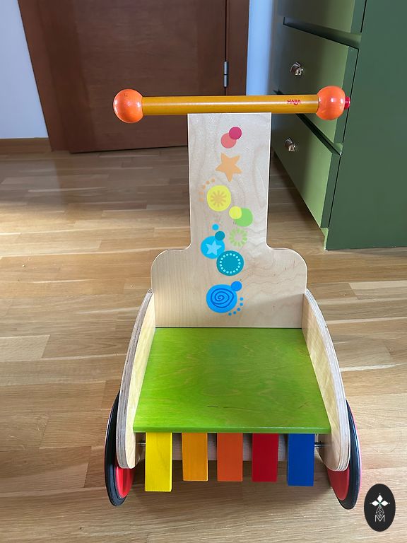 Practical IKEA MULA baby walker, perfect for babies and toddlers learning their first steps. The sturdy design helps children practice balance and walking while pushing the cart.