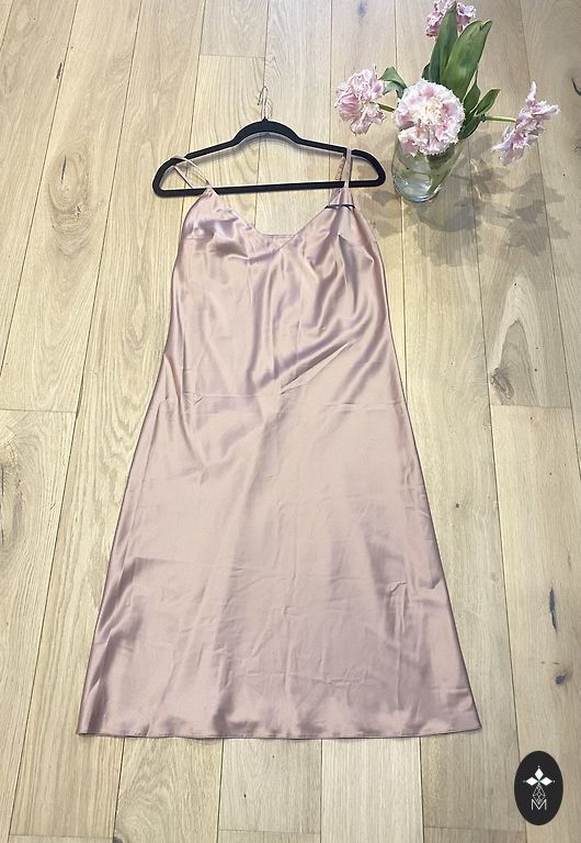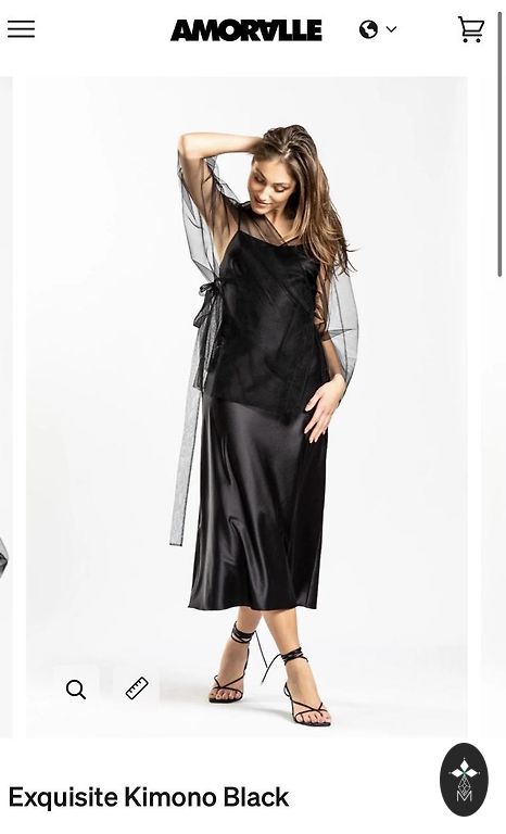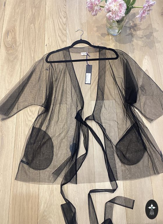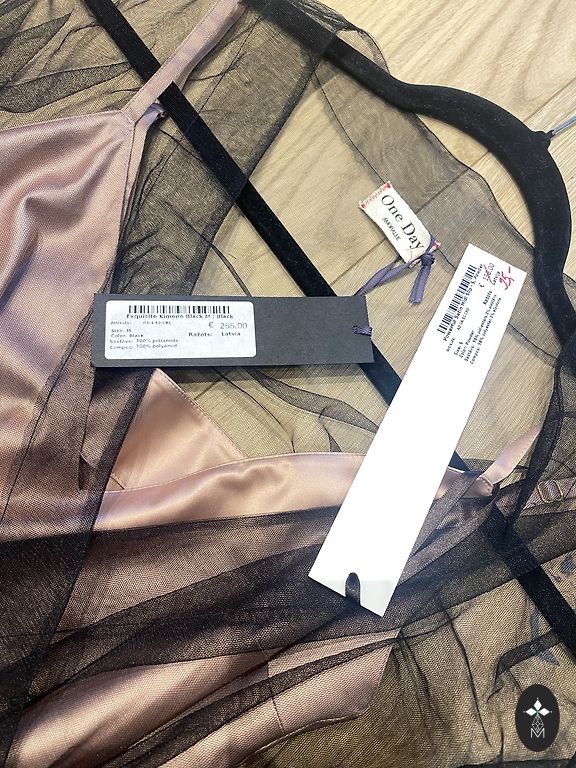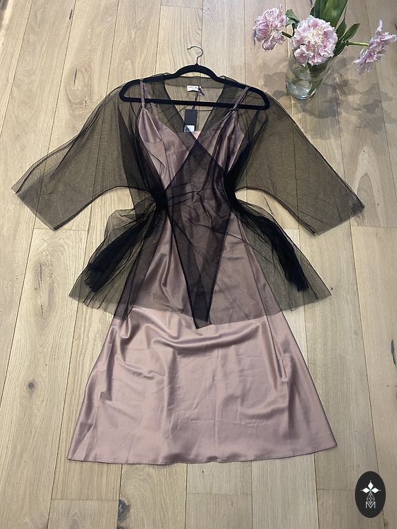 Very elegant dress. Soft, stretchy dress with a gold lace overlay that wraps over from the right side. This part is tied with a velvet ribbon. Neckline and sleeve ends also have velvet trim.
