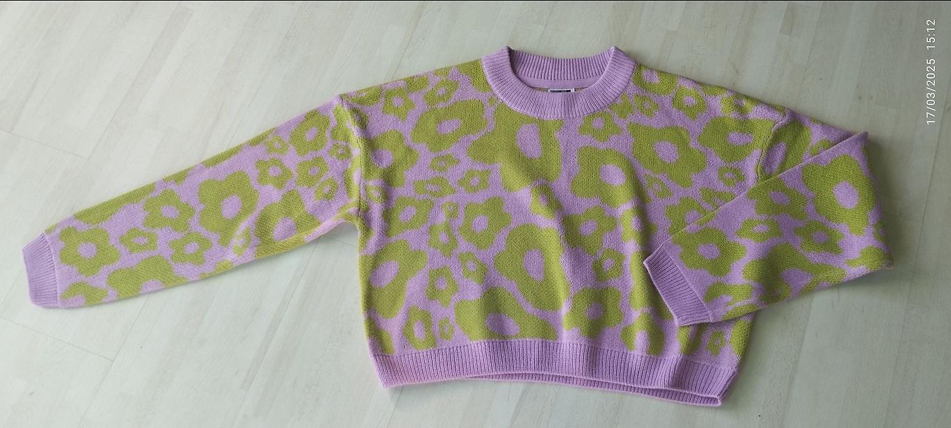 Uus, mitte kordagi kantud. Lühike džemper. Kantav üksi või valge särgi peal jne. Lilla ja roheline - suurepärane värvikombinatsioon! Laius kaenla alt venitamata 60x2, venib veel hästi. Selja pikkus 48 cm. 100% akrüül.