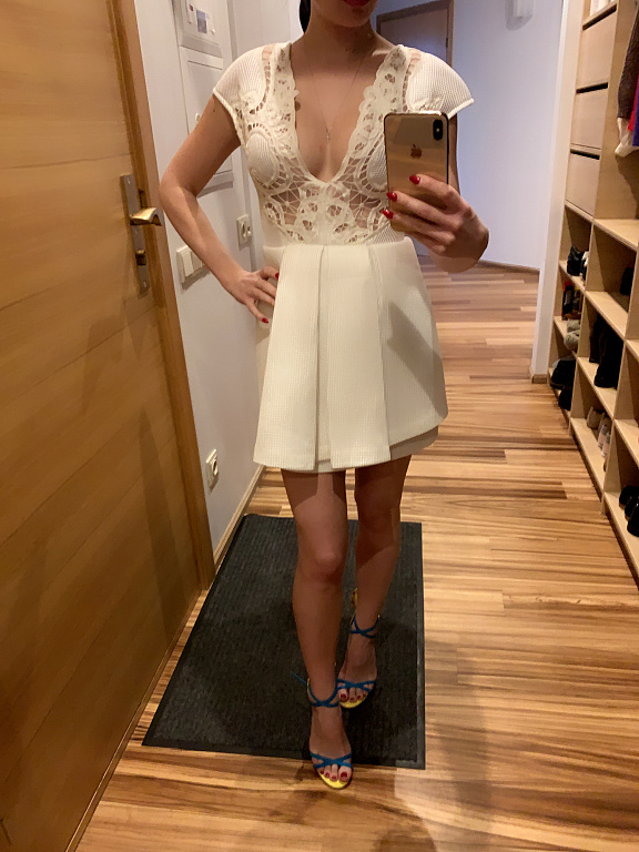 Элегантное белое кружевное платье с длинными рукавами и поясом на талии. С нижним платьем. Женственный, праздничный фасон. Надето 2 раза, в очень хорошем состоянии. Обхват груди 101 см, длина 88 см. 💌Отправляю, доставку оплачивает покупатель.