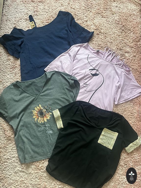 Trousers - waist 38 cm, hips 46 cm, outer length 101 cm. Made of 75% cotton, part polyester, and elastane. Trousers are not stiff, fabric stretches, high waist. Worn 2 times. Two blue tops - Grace Karin, bust 48-49 cm. Combine formality, seriousness with comfort and femininity.