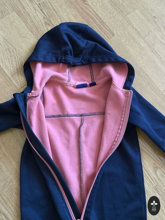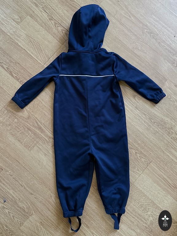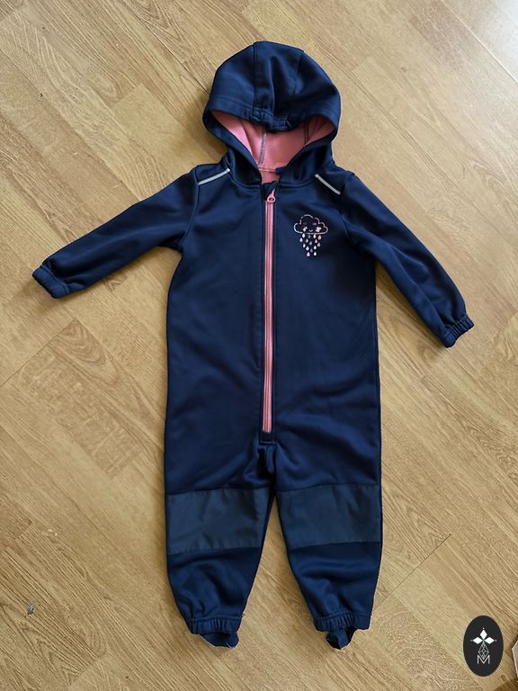 Žavingas kombinezonas tarpsezoniniams orams. Be reikšmingų naudojimo požymių, yra naudojimo žymių ant kelių, kurios matomos nuotraukoje. Kitaip be trūkumų. Gumos sveikos.