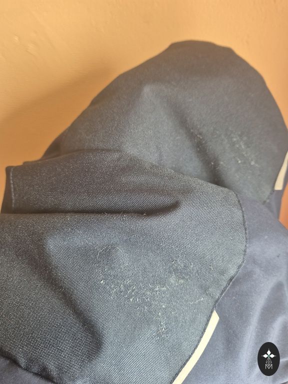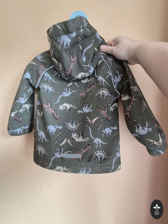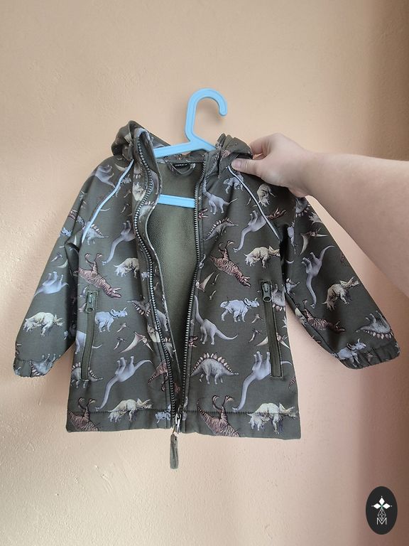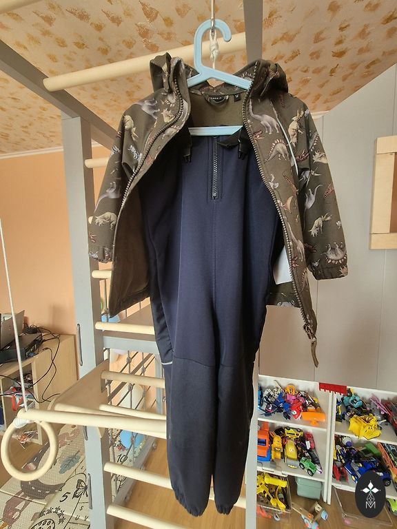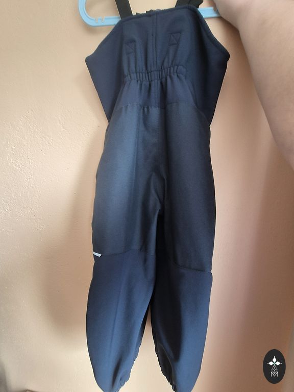 Quality softshell suit with lining. It has a high collar to protect the neck from the wind and additional sleeve extension for warmer wrists. Reflective elements on the shoulders. Leg elastics are trimmed. A small stain on the inner seam of the left leg, visible upon close inspection. The manufacturer indicated size 104.