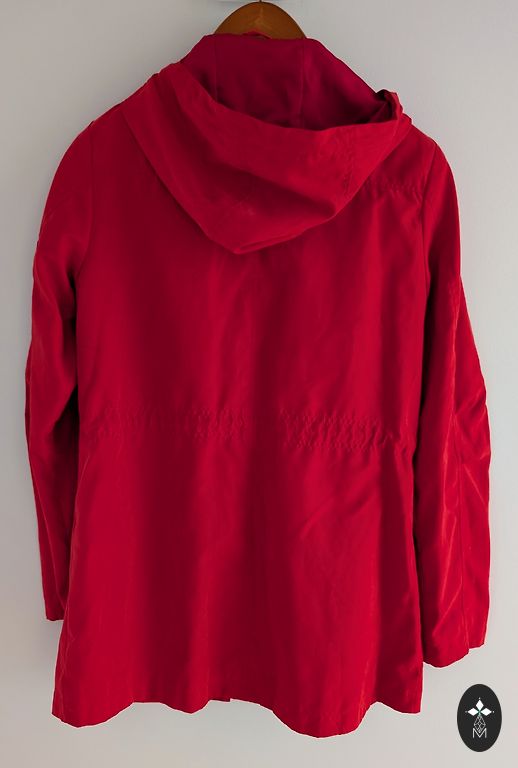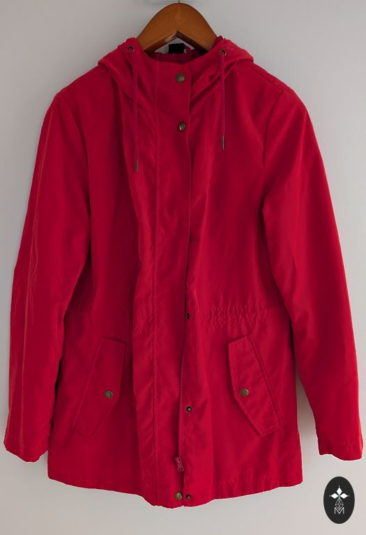 MasCara spring/autumn coat for women. Brown with a black floral pattern. Size 38, length – 95 cm. With lining. Two outer pockets. Single-breasted button closure. Firm fabric (14% wool, 46% polyester, 35% polyacrylic). Machine washable at 30 degrees, can be ironed. Neither the coat nor the lining fabric is worn out, torn, or has lost color brightness. If interested in specific measurements in cm, just ask!