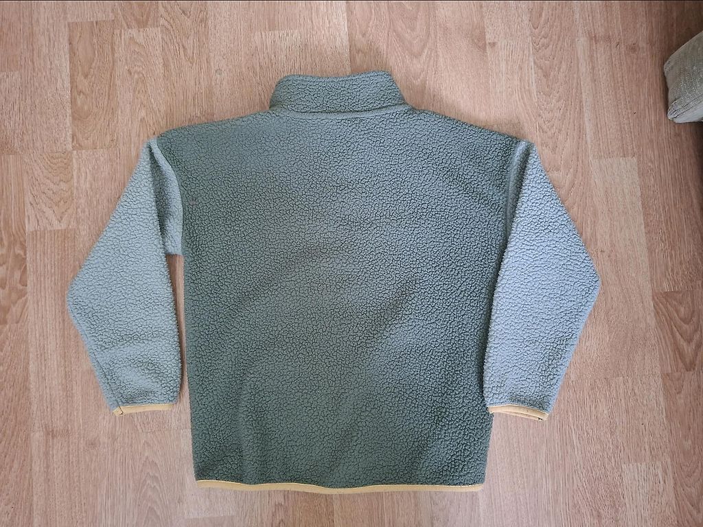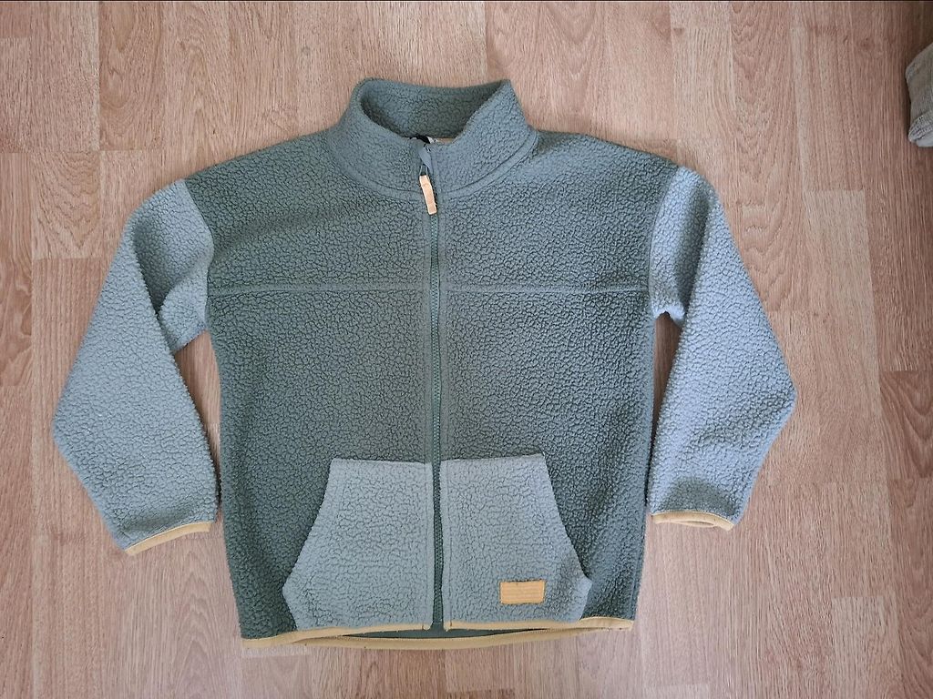 Minkštas pūku paltas (pile jacket) su gobtuvu, užsegamas sagomis.