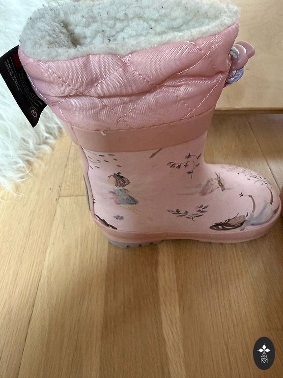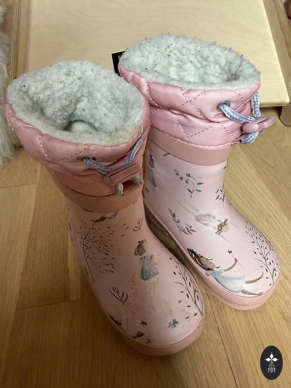 Stylish and warm rubber boots, worn both in winter and spring, thinner than regular ones. Here and there, small scuffs or black marks are visible. The boots have been washed.
