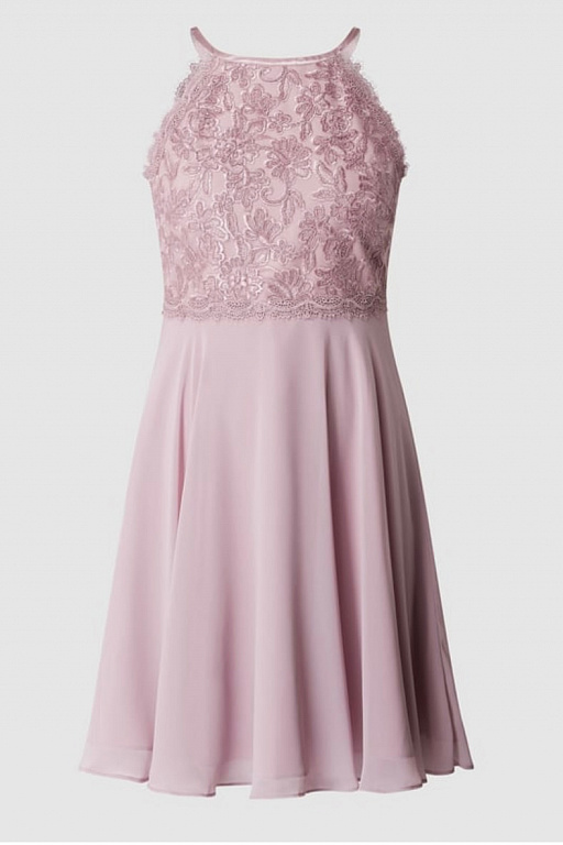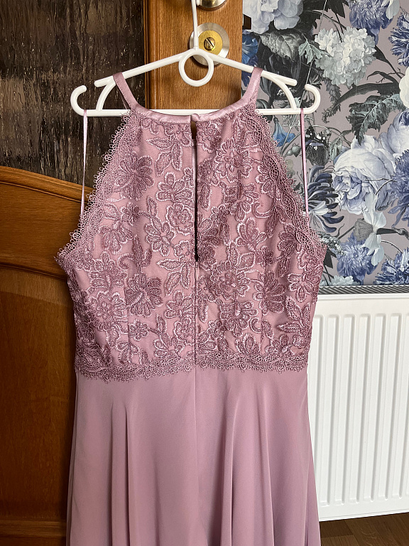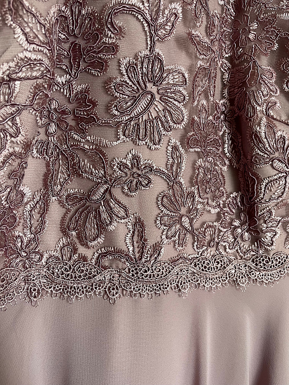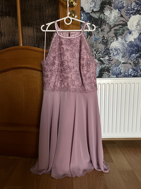С верхом из тюля! Часть юбки из атласа (нежно-розового цвета). Верхняя часть с кружевом - старо-розового цвета. Встроенная часть для груди. Сзади молния.