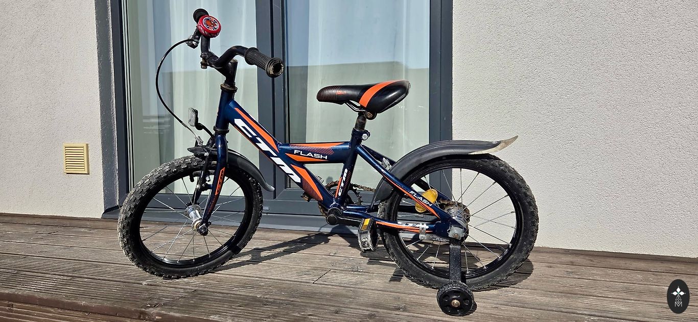 Ctm Foxy bērnu velosipēds ar 16" riteņiem. Alumīnija rāmis. Dzīvi ir redzējis (pēc 3 puikām), daudz skrāpējumu, stūre aprūsējusi, pazudis ķēdes aizsargs un priekšējais dubļusargs, bet braukt var :)
