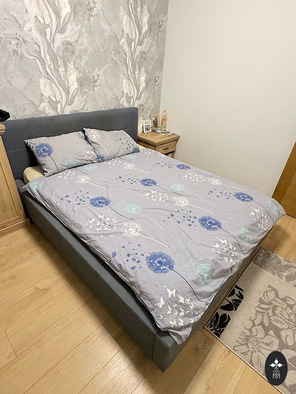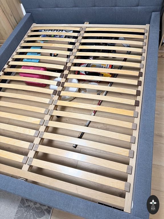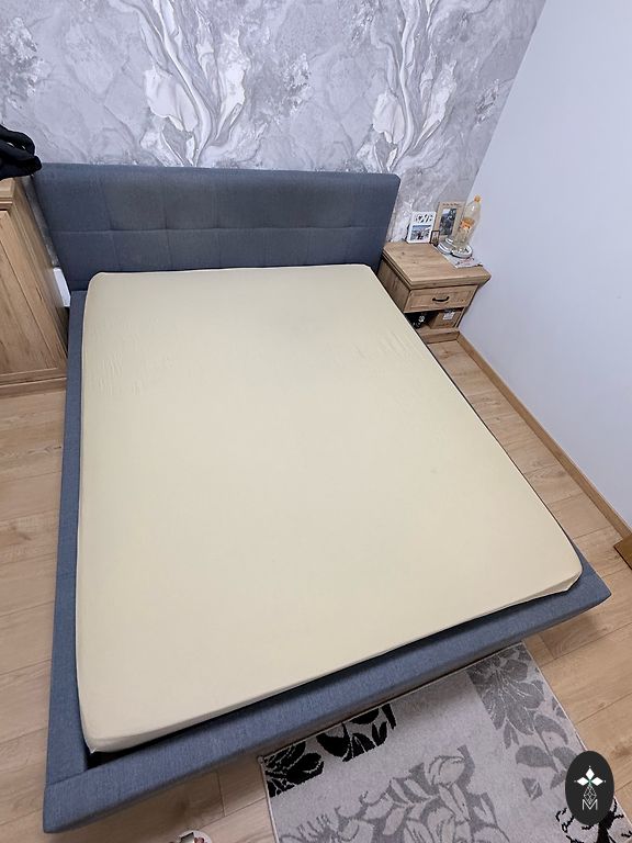 The bed edges and headboard are made of very soft velvet. There is also a liftable linen box. The bed has been used for 2 months.