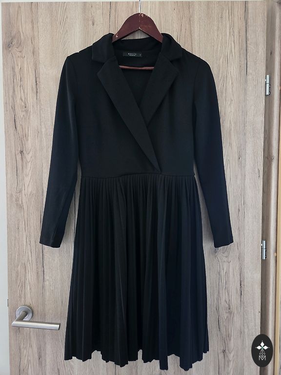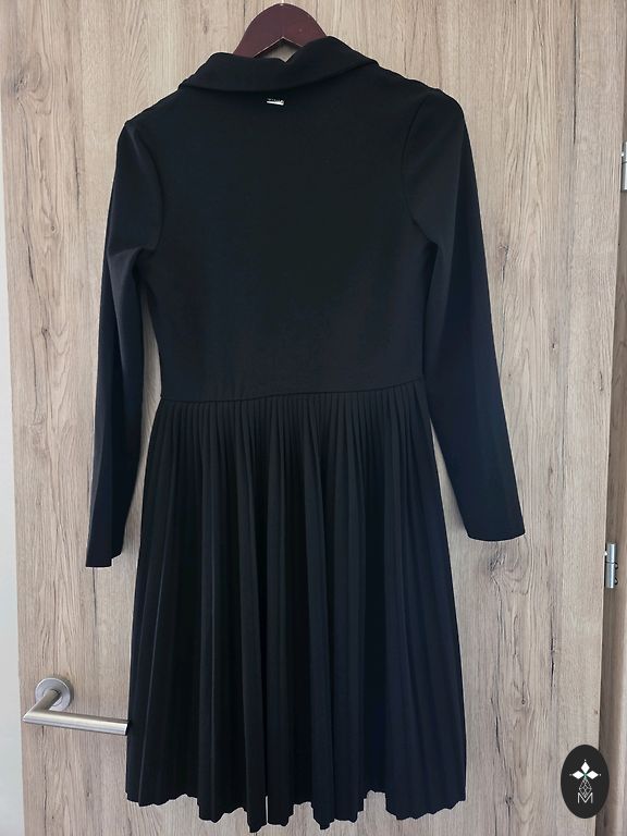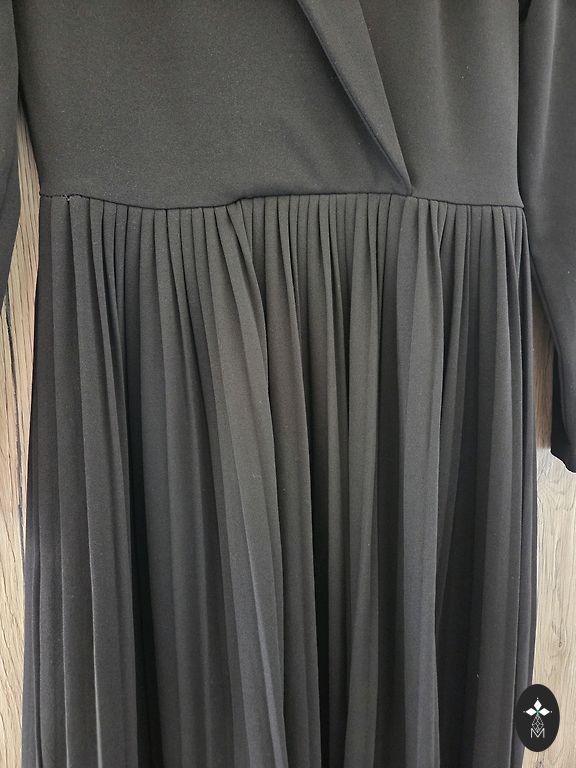 Minkštas audinys. Suknelė yra juoda, bet su vertikaliomis linijomis. Kairėje pusėje nedidelis plyšys. Ilgis 120 cm.