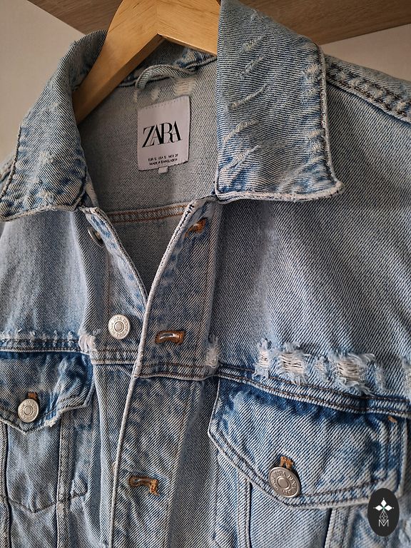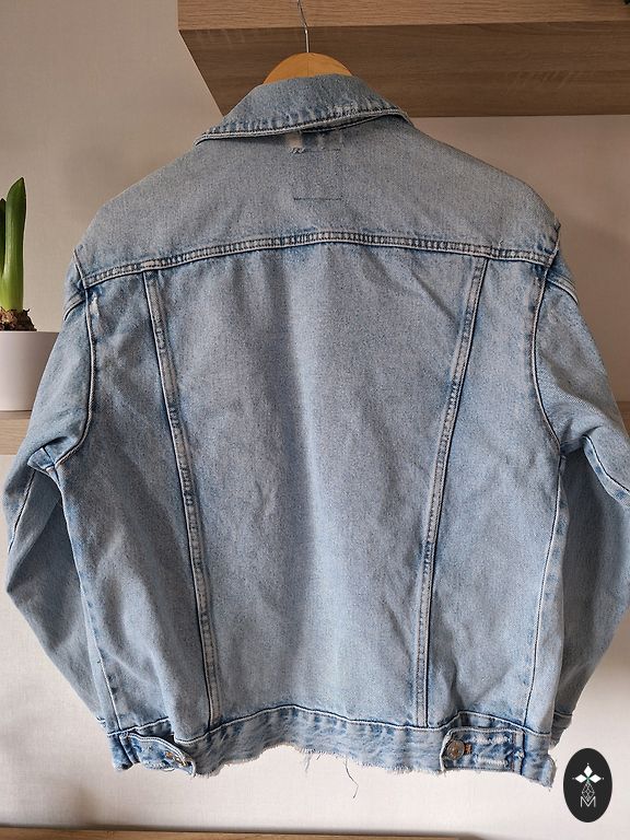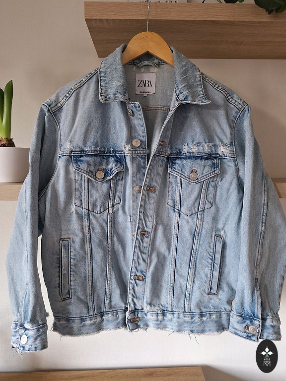 Kerge, vaba, kevadine mantel nööpidega. Pikkus 100 cm, tagumine pikkus 5 cm pikem, varruka pikkus õla servast 60 cm, väikese defektiga, veidi kokku tõmmatud kangas (pildil märgitud ala 12 cm x 11 cm), vähe märgatav.