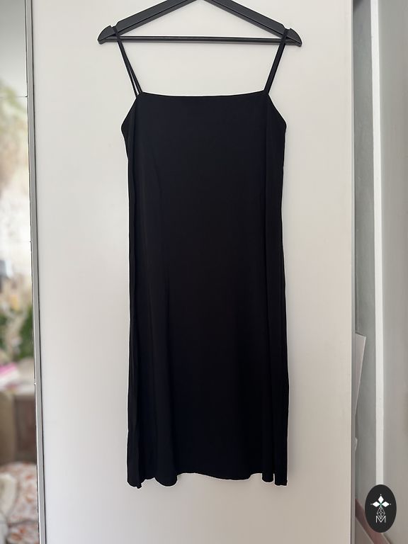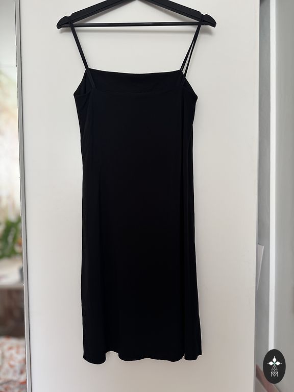 Midi juoda suknelė. Puikiai tinka vasarai. Kelis kartus dėvėta. Lenzing™ Ecovero™ viskozė 63%, linas 37%.