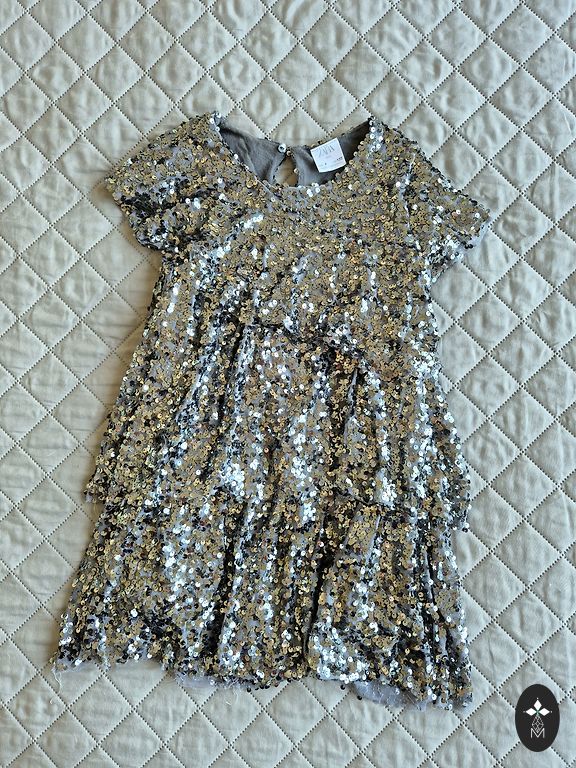 Kahepoolne hooajaväline mantel, ühelt poolt kohevil, elegantselt must hõbedaga, teiselt poolt särav, pigem fuksia värvi. Seisukord väga hea, suurus 128.