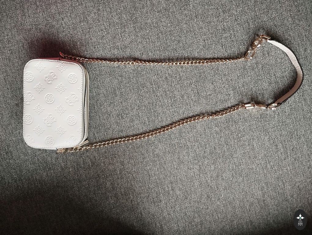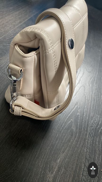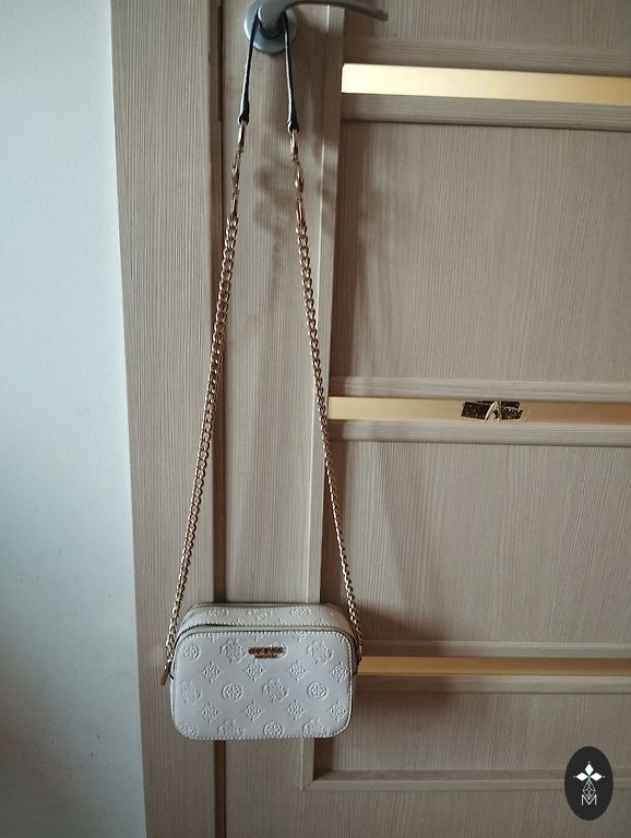 Praktiska bronzas krāsas soma ar garu siksnu. Trīs nodalījumi, divi no tiem ar rāvējslēdzēju. Ietilpīga. Siksnas garums ir regulējams. Izmēri 26 × 16 cm.