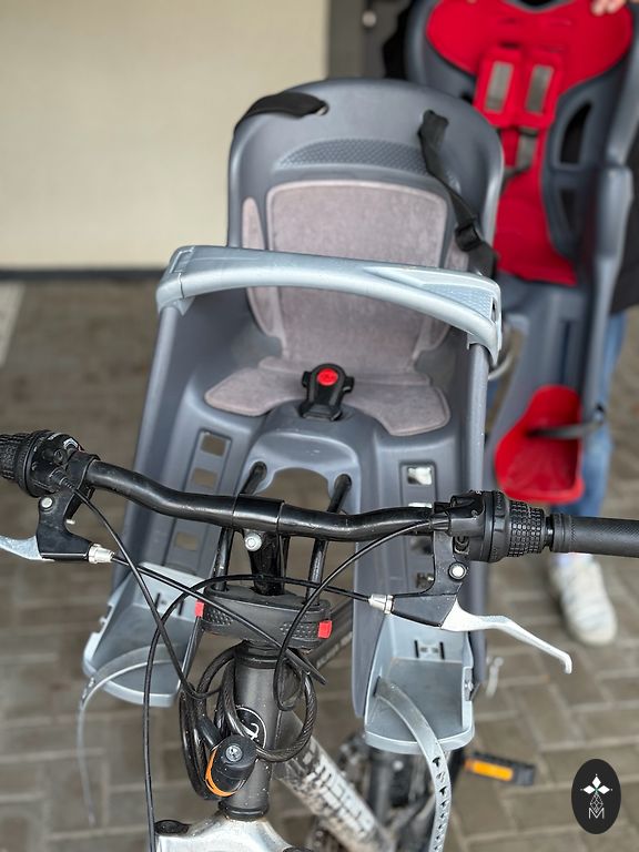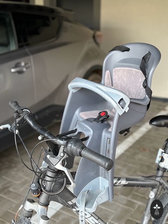 Велокресло, крепящееся на багажник велосипеда, с трехточечным ремнем безопасности. Предназначено для ребенка весом 9-22 кг. Имеется естественный износ, местами царапины, которые не мешают использованию. Незначительное повреждение пластика снизу, не мешает использованию. Находится в Риге.