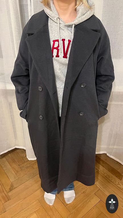 Новое полушерстяное (шерсть50%) пальто в стиле длинного пиджака. Заявленный размер M, но подойдёт на S-M. Длина по спинке- 115см; по линии груди- 50см; длина рукава- 60.