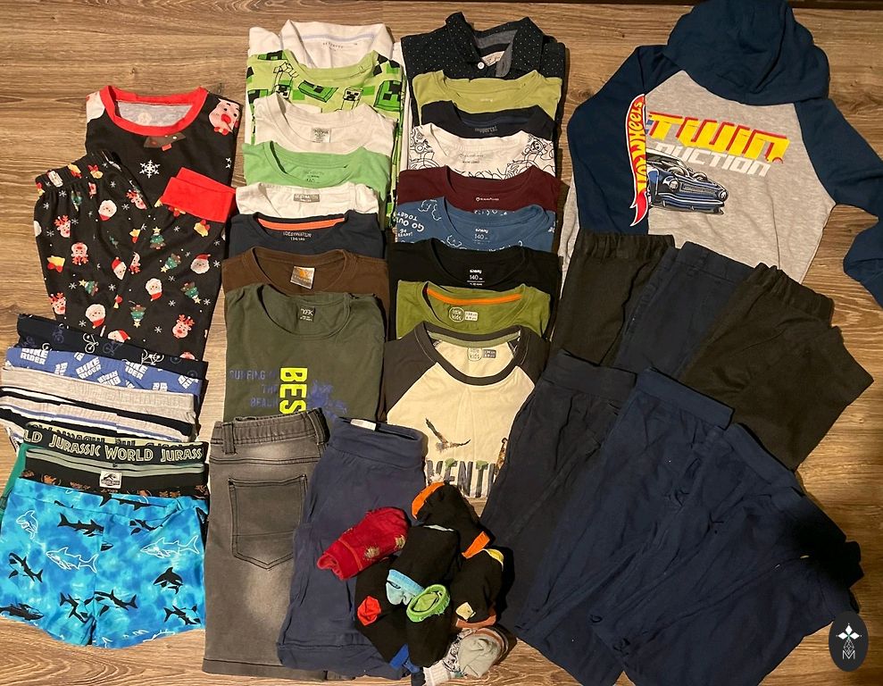 1 - kombinesoon, 2 - magamiskotid, 1 - teksadest roomik, 2 - mütsid, 9 - püksid, 3 - erinevad jakid, 1 - džemper, 3 - bodyd, 1 - pidulikum roomik, 1 - pükste sarafan, 1 paar - sussid/saapad, 1 - t-särk
