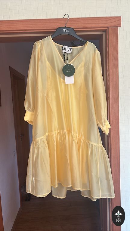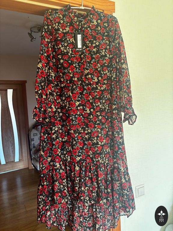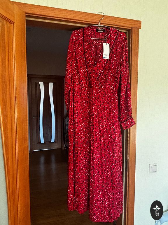 Kleita ne reizi lietota, tikai uzmērīta. Izmērs ir L, taču derēs vairāk M izmēram. Var arī nelietot siksniņu, tad kleita derēs arī XL