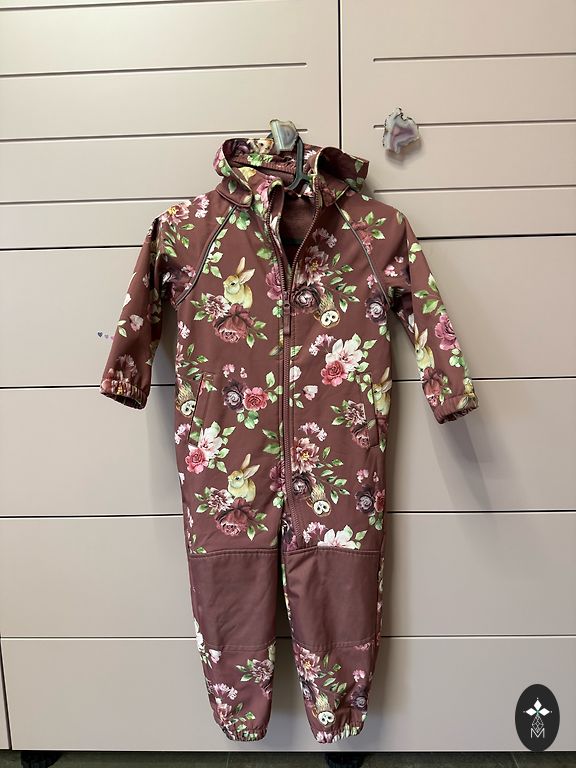 Ļoti skaists iELM Softshell kombinezons meitenei 98. Izmēra. Cītīgi lietots - dibena daļā ir tumšāks audums iekrāsojies, ir daži pleķi, bet uz raibā printa nav tik uzkrītoši.