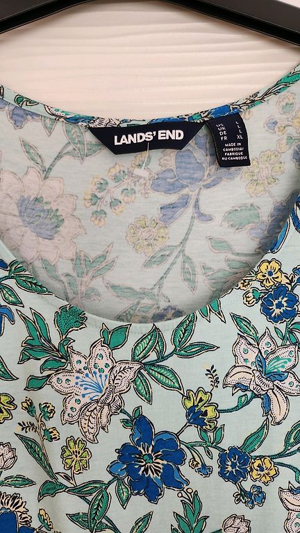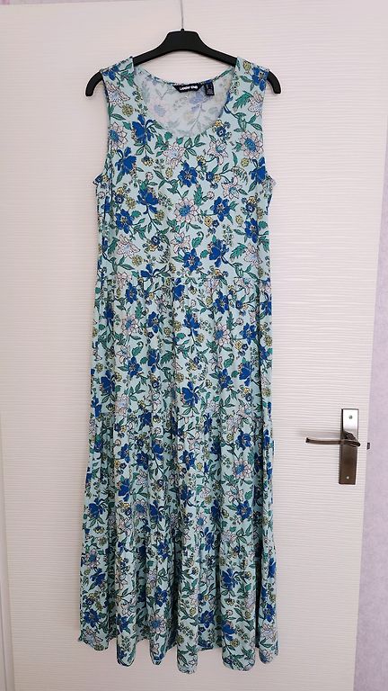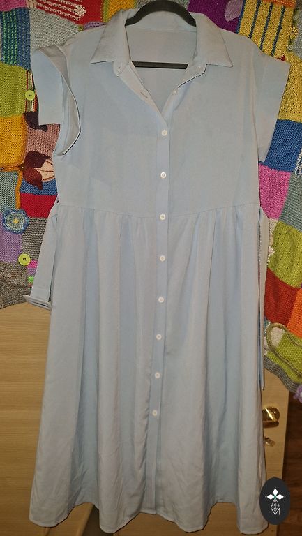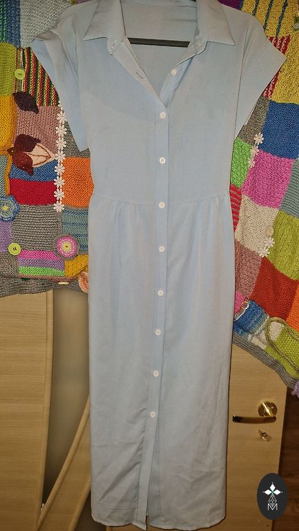 Nelyginta, geros būklės, be defektų, medvilnė. Man atrodo, kad geriau tiktų 38/40 dydžiui, nors nurodyta 40. "A" kirpimas, modelis toks, kad nugara šiek tiek (~10 cm) ilgesnė nei priekinė dalis. Ilgis nugaroje ~100 cm.