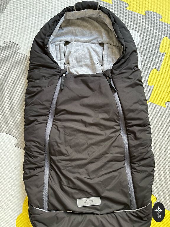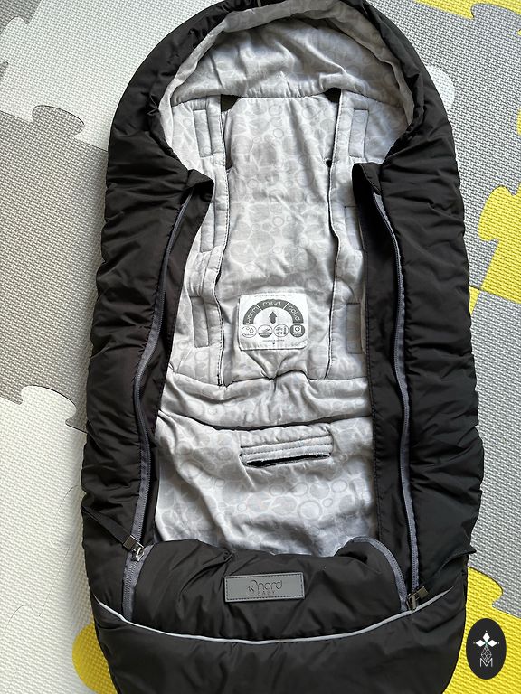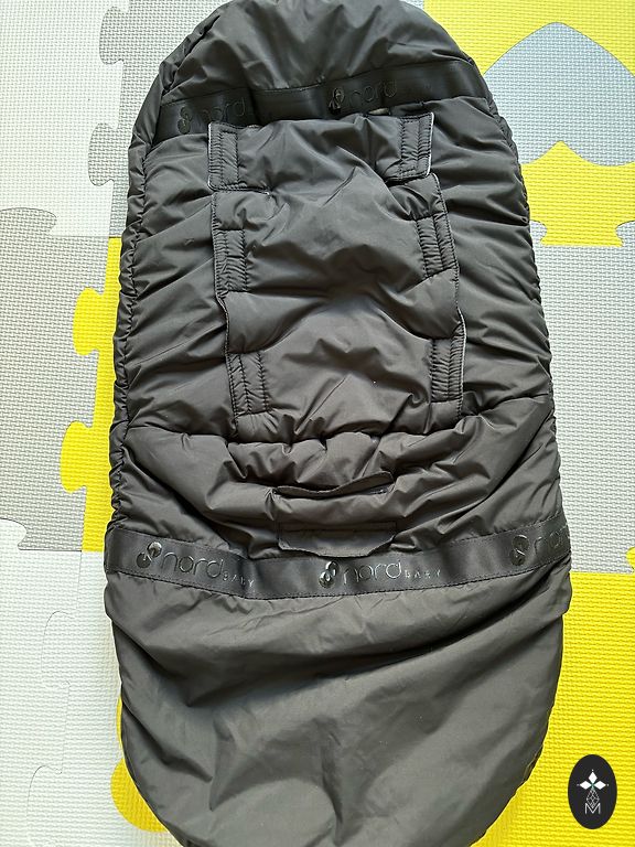 Warm sleeping bag for a baby in a stroller and/or car seat. The down is removable with buttons.