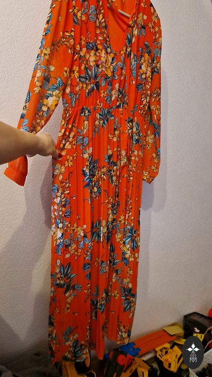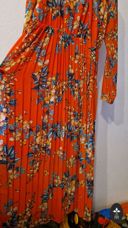 Suknelė iki kulkšnies, boho, hipių stiliaus, spalvinga, puikus lengvas, plaukiantis audinys, šilkas su viskoze. Ideali vasarai ir pavasariui. Vienas dydis, tinka visiems, oversized kirpimas, laisva, su guminiu diržu po krūtine. Puikiai maskuoja figūros trūkumus 👍 Aš dėviu L, XL ir suknelė atrodo būtent taip, kaip nuotraukoje. Tiks nėščioms ir + dydžio moterims. Tiks bet kokiai progai, šventėms, paplūdimiui, vakarėliams ir pan. Ilgis 140
