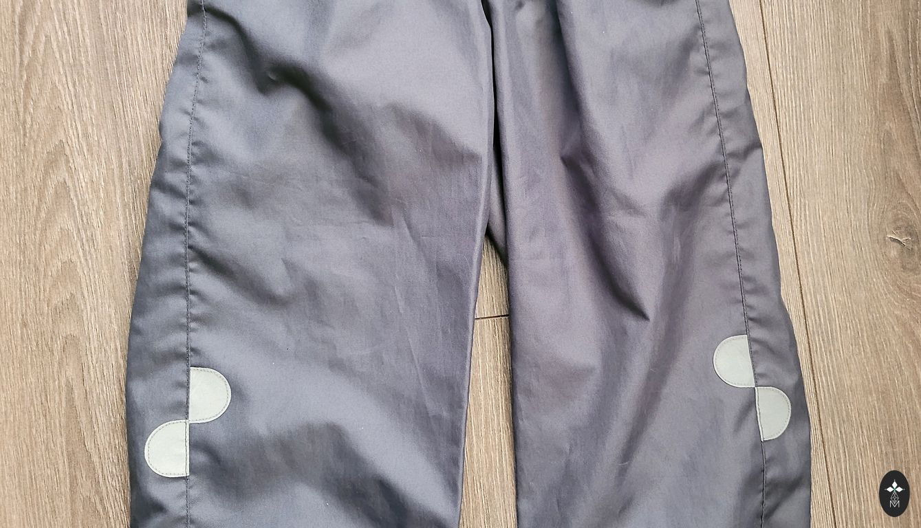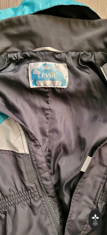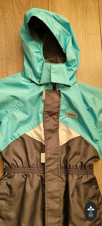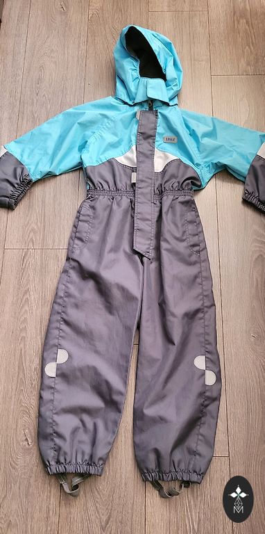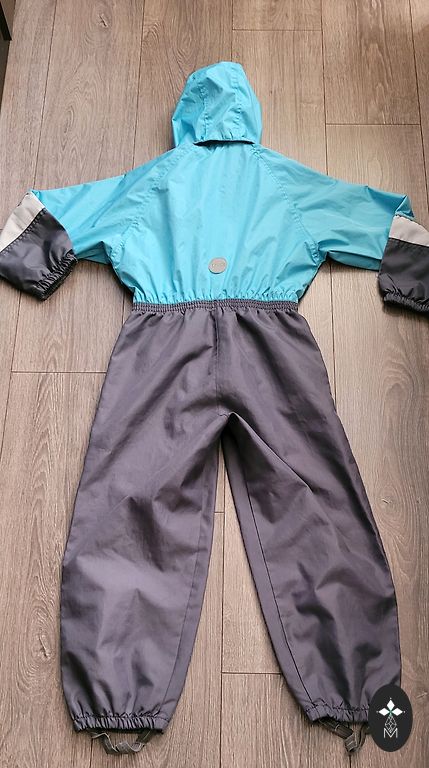 Insulated softshell jumpsuit. There is no elastic at the bottom of the pants. Signs of use are visible, more on the bottom and knees. Photo visible.