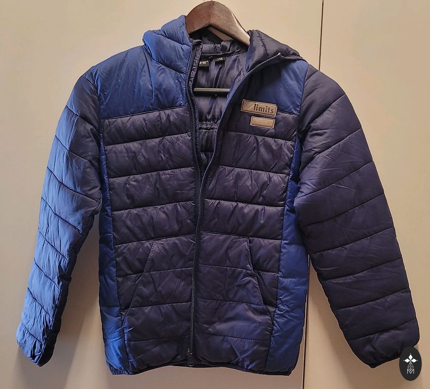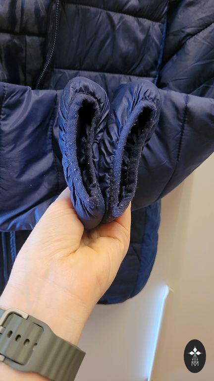 Пару раз использованная весенняя куртка темно-синего цвета. Есть светоотражающие элементы. Размер 116/122. Длина рукава около 45 см, длина куртки 48 см, под мышками 36 см. Защита от воды и ветра. Тонкая, без теплой подкладки.
