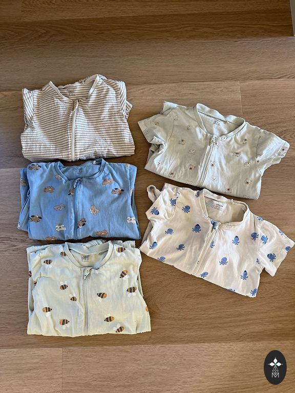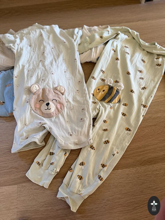 Īsā pidžama ar leopardiem; 2 garroku bodiji ar tīģeriem un suņiem. Visas vienības uz 86 jeb 12-18mēn, Salaspils vai sūtu.