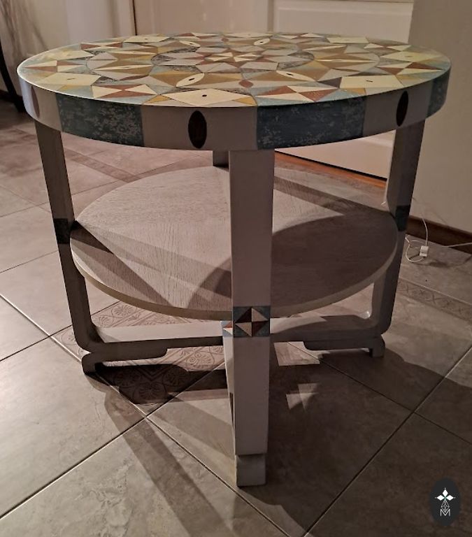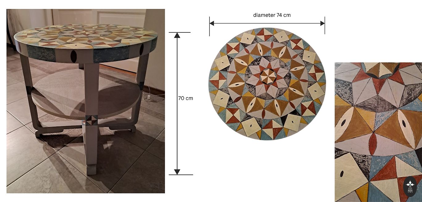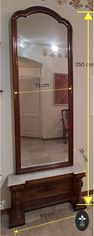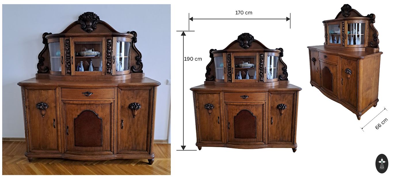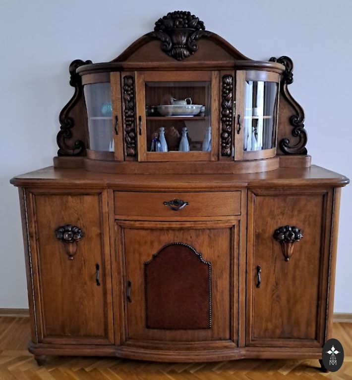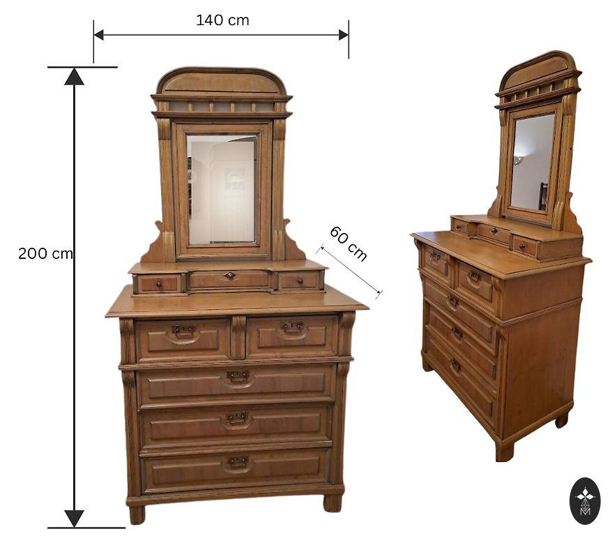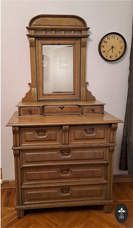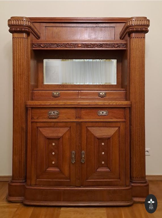 Vintāžas koka skapis bez plauktiem un ar divām atvilktnēm. Skapis ir dekorēts ar kokgriezumiem un dekoratīvu gleznojumu.