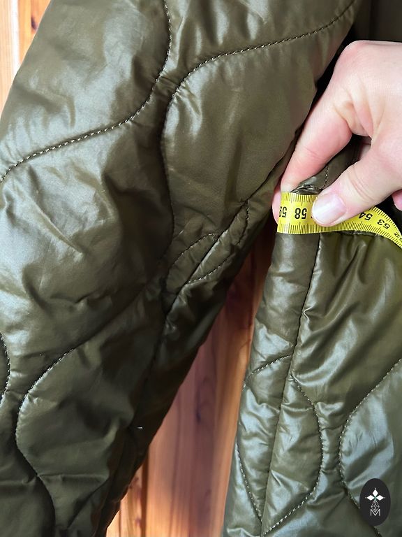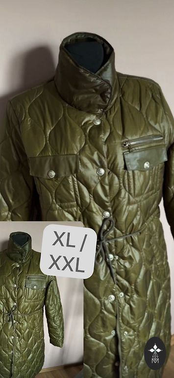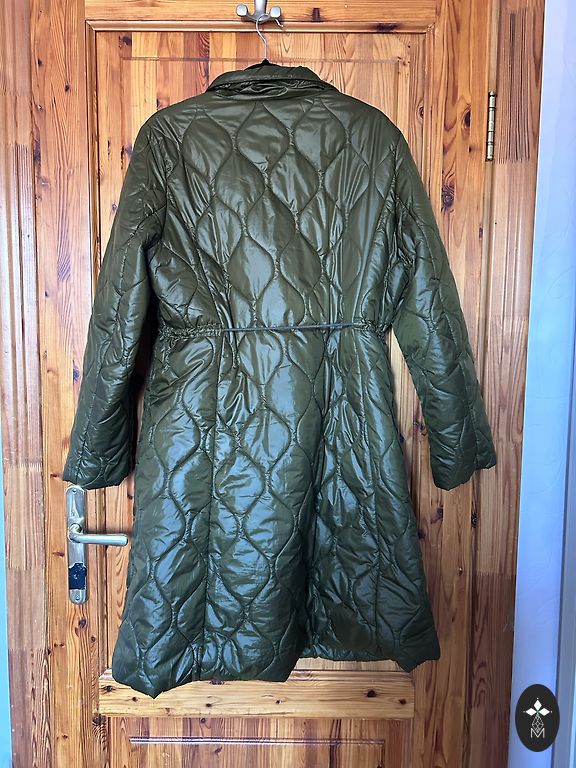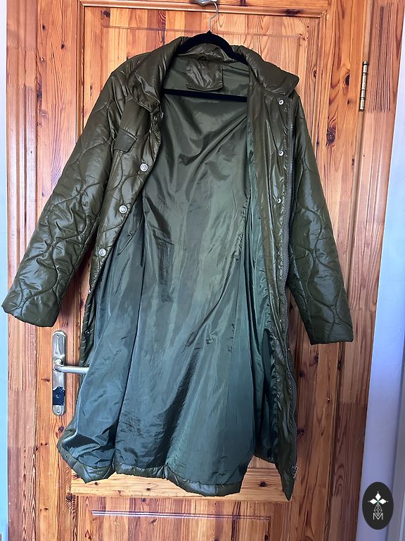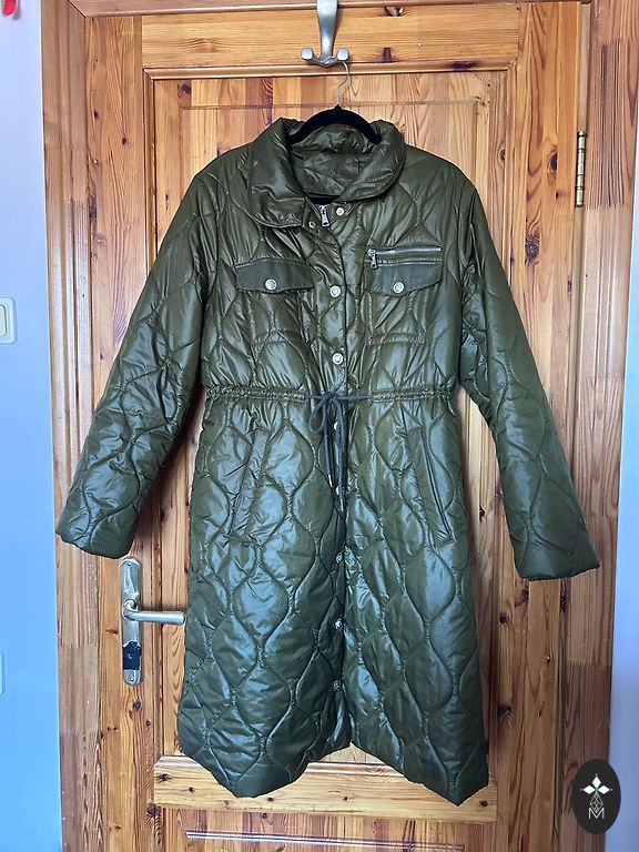 Пальто из приятной, мягкой ткани, легкое и воздушное. Подкладка бежевого цвета, а само пальто темно-зеленого, хаки цвета. Есть капюшон и карманы. Размеры: длина 103 см, от подмышки до подмышки 78 см, по бедрам примерно 160 см. Измерения проводились по внешней части пальто.
