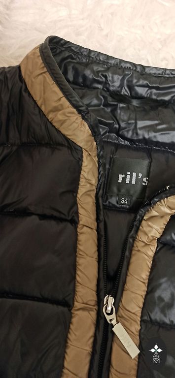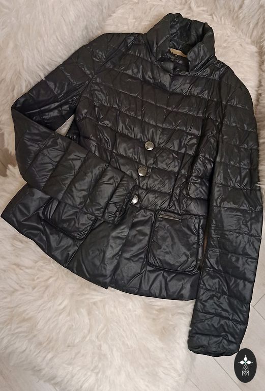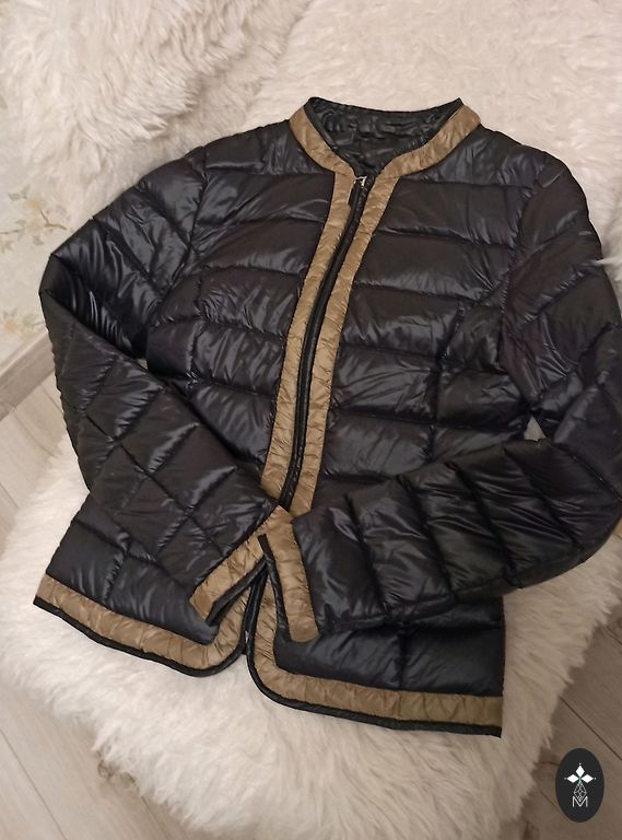 Detalės: Kontrastinga juoda apdaila aplink apykaklės kraštus, atlapus ir ant dirbtinių kišenių (atlapų) ties juosmeniu.