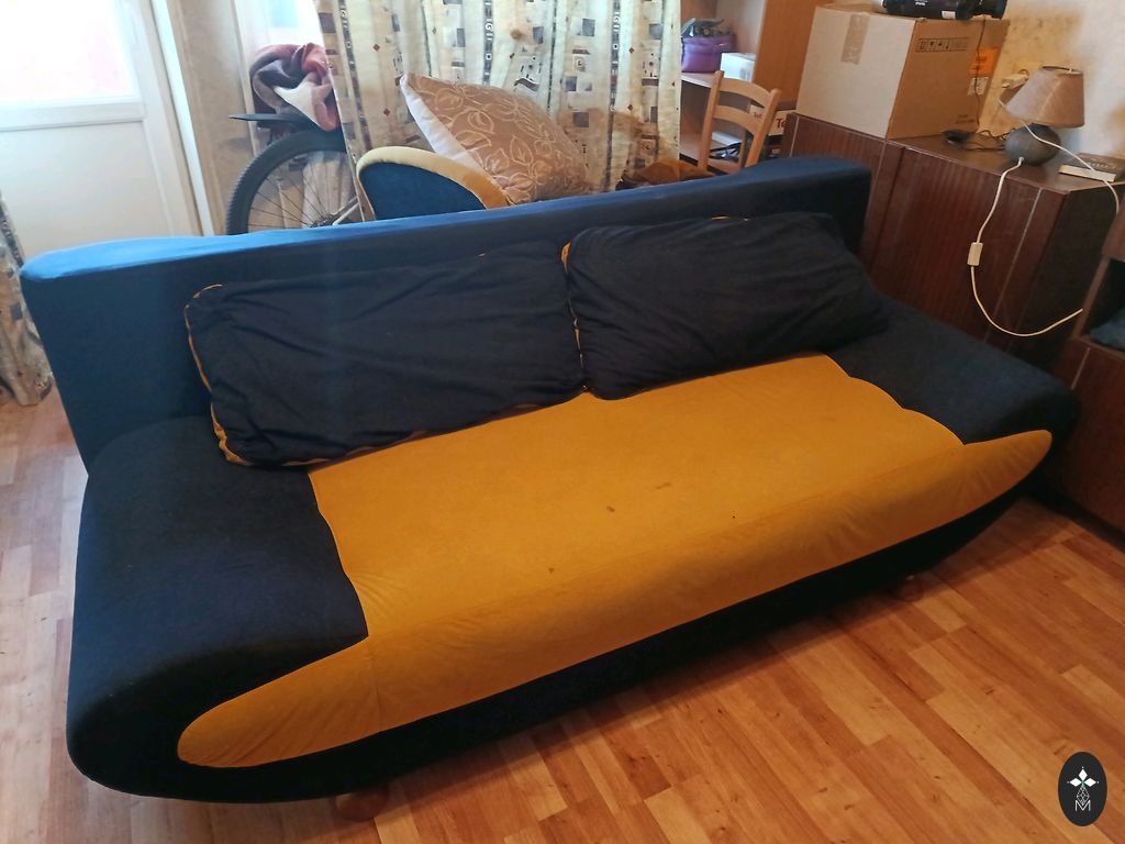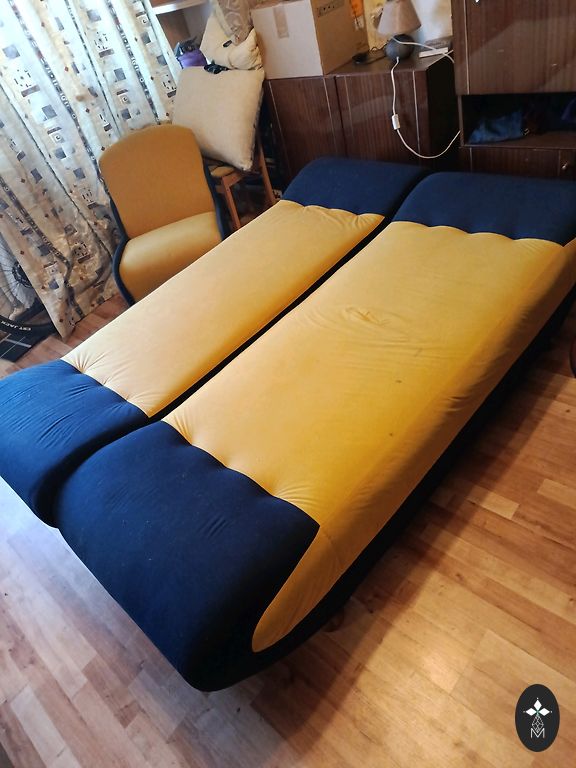 Складной диван с ящиком для белья в очень хорошем состоянии. Использовался как кровать, с верхним матрасом. Есть небольшие вмятины в двух местах, где верхняя часть опиралась на основание. Длина дивана 195 см, ширина в сложенном виде 95 см, спальное место 145x195 см.