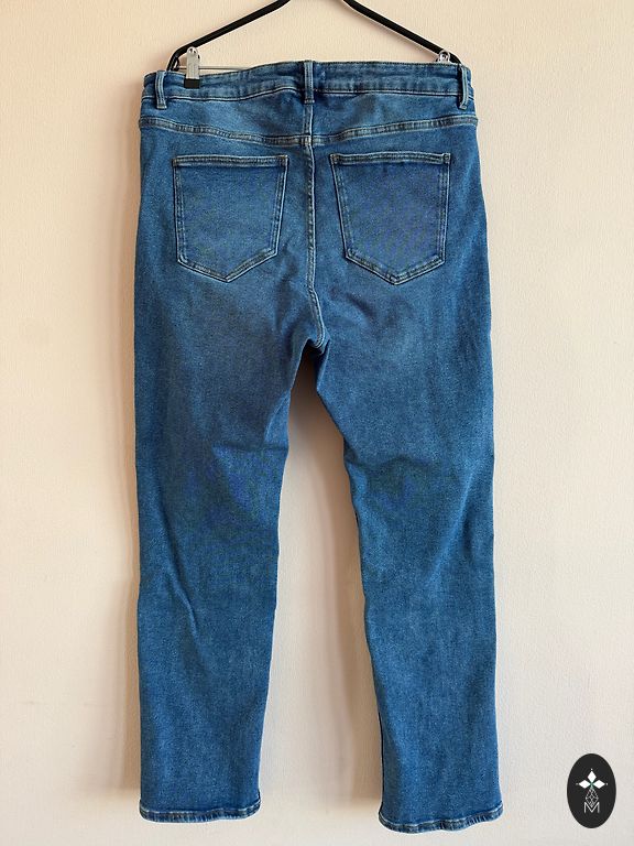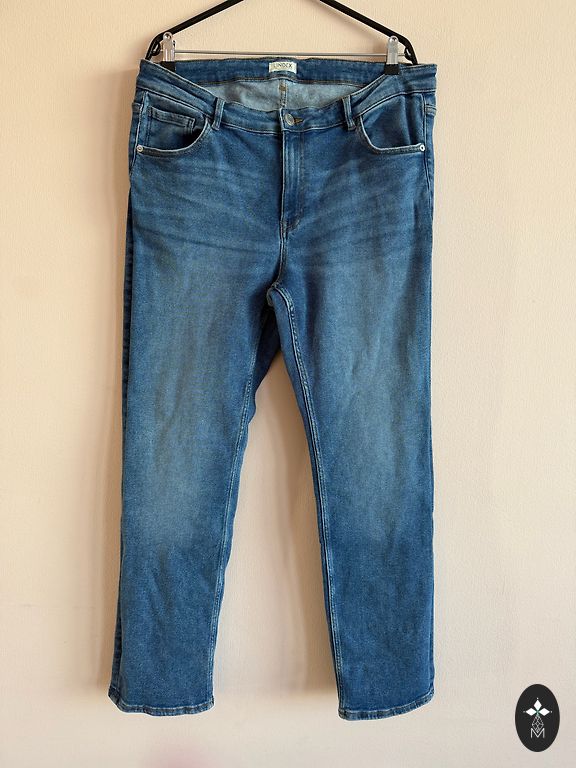 Светлые джинсы с широкими штанинами, эластичные, пояс - 116 см, бёдра - 140 см, длина штанин снаружи от пояса - 110 см, длина штанин внутри - 80 см, ширина нижнего края джинсов - 35x2 см, цена 8 евро + Omniva.