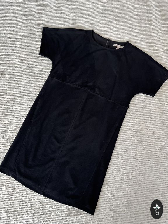 Krāsa ir melna. Pilnais garums 90 cm, platums krūtīs 44 cm. Piedurknes var nēsāt arī neatrotītas. Piegāde cenā.