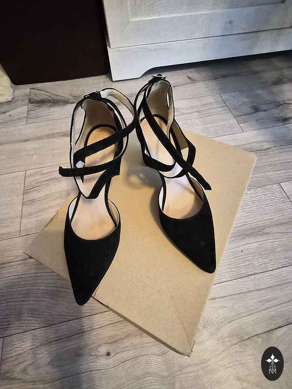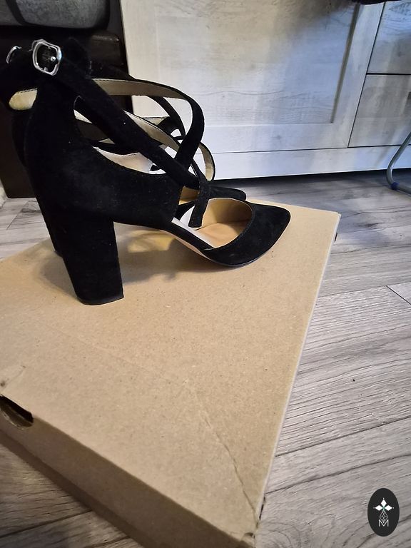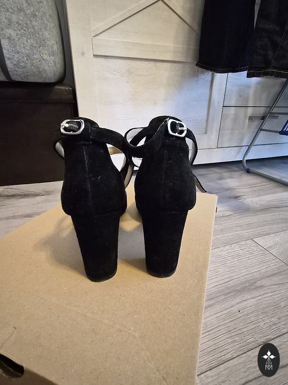 Classic suede shoes. Very high quality. Outside in perfect condition: suede, heels, sole. Put on a couple of times indoors. The only trūkums- inside crumbles protective coating, which covered the skin from the inside. When wearing this is absolutely not visible. I think it can be repaired, if you take to the shoe shop or clean yourself with sandpaper. Heel height 8 cm.