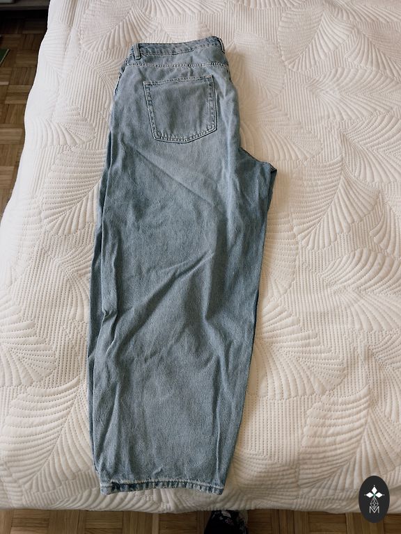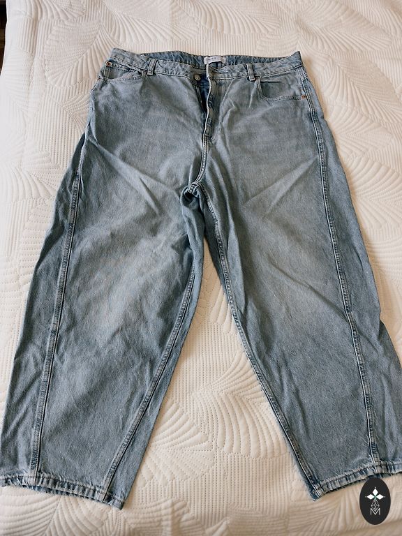 Kordagi kantud teksad, milles on lükra, küljetaskud, vööümbermõõt 86-106, puusad 110-120, jala pikkus jalgevahelt 70 cm. Vööd ei ole, ei tea, kuhu olen selle pannud, aga ei leia ja see ei sobinud ka tegelikult sinna. Saledama figuuriga näevad vööga välja nagu vaba stiili püksid.