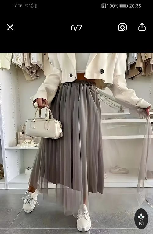 Новые, темно-серые юбки 42 размера. Легкие и свободно падающие, есть резинка. Талия в нерастянутом состоянии - примерно 88 см, в растянутом - 104 см, длина юбки - 95 см.