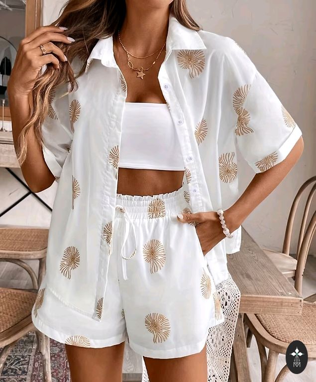 Šis sieviešu vasaras komplekts sastāv no īsroku krekla un pieskaņotiem šortiem, kas dekorēti ar izšūtu vai apdrukātu gliemežvāka apdruku.