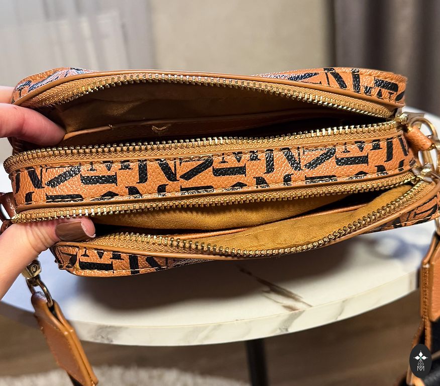Сумка имеет две стороны разных оттенков. У неё есть средняя по длине плечевой ремень и деревянные ручки. Внутри три небольших кармана (для телефона, косметики и т.д.). Внутренняя часть сумки красиво отделана цветной тканью.