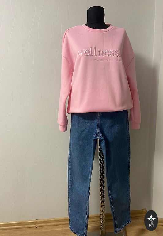Синий свитер и джинсы.