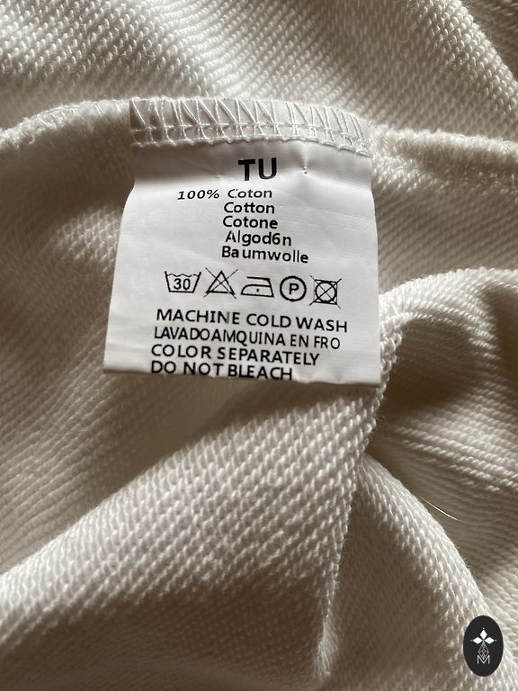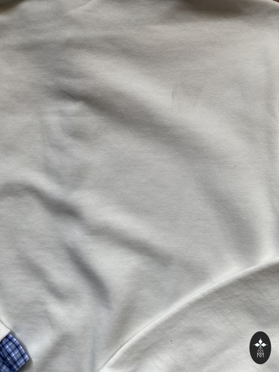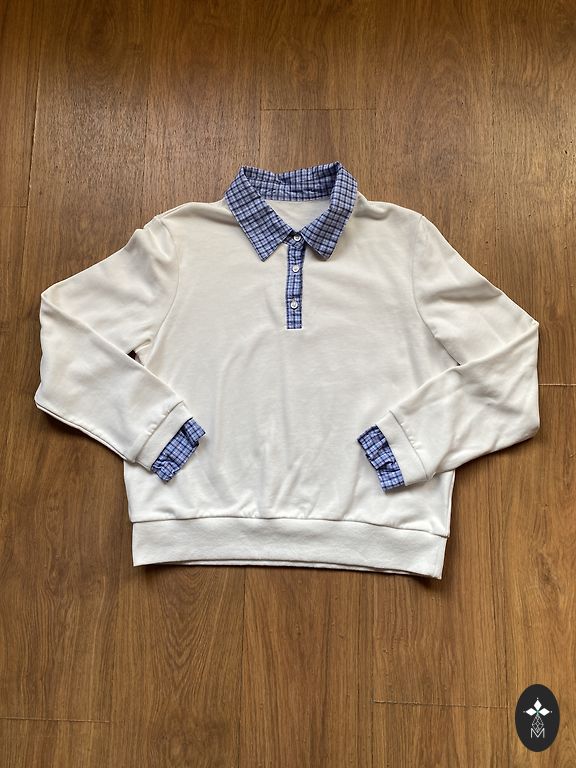 Rankomis megztas minkštas megztinis, krūtinės apimtis 100 cm, ilgis 56 cm, rankovės pusilgos. Spalva gelsvai balta kaip kaimiškas grietinėlė.